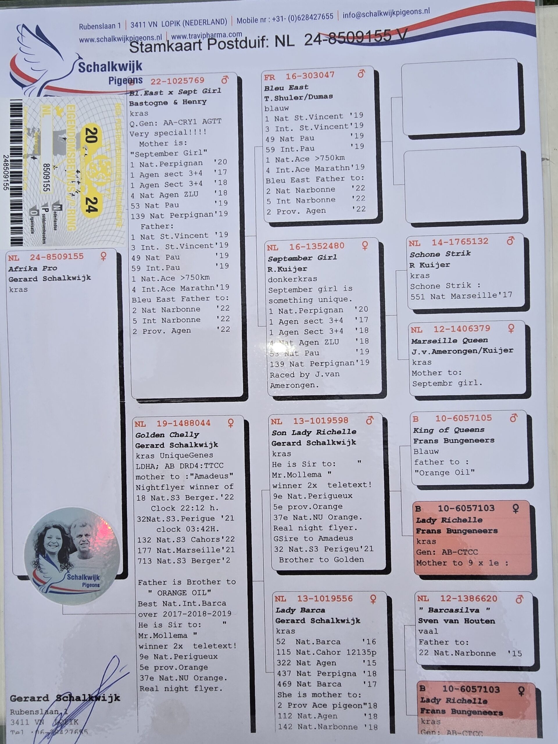 .LOT 2 AFRIKAPRO AUCTION 5 – Hok Reijnen-BE-24-3106793 -SIRE:NL 22-8542499 M Golden Basic Boy Reijnen-Bolton-Hoogh Donker Geschelpt 1/2 Broth.25-6050979 Acepigeon Overall.————–DAM:GRPF-22-1046 V.PIGEON PALACE.DAM IS 18-82875 V “Super Twilight” Kings & Gijs Louw BCH Super racer middle to long distance. Bred from a line of SANPO Gold medal winning pigeons. Tis hen’s first baby was a double winner 1st & 2nd union against more than 1500 pigeons.SEE PEDIGREE!!!!