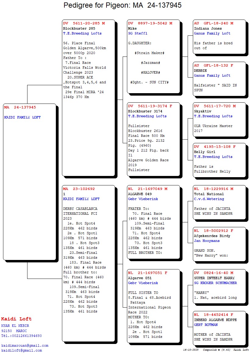 LOT 31 AFRIKAPRO AUCTION 4 – Tom van Gaver – Alberto Abajo ES-BE-25-4056614 -SIRE:BE 19-4216712 C.Perfect Finn Tom Van Gaver Geschelpt (G-) Father to: 2. Ace PIPR 2025 7. Prov 5.327 birds Toury 2024.115. Final OLR Sofia 480 km – 2022 111. H.S 6 VFWCPR 23. 262. Final VFWCPR 23 55. Ace AS Gold 2022 46. Fin AS Gold 2022 69.-82.-87.-69.-100. In hotspot race. 44. Prov 1.488 birds Ecouen I 2024 21. Comb 1.458 birds Montoire 2023 111. N.Z. 2.986 bird Bourges II 2023 121. N.Z. 1.937 bird Bourges I 2023 103 Prov 1.715 birds. Full brother FINN: 1. Prov 1.591 birds 1. N.Z. 2.761 birds 9. Nat 7.322 birds 1. Fastest 652 birds.—————DAM:BE 22-4198272 H Blue Finn Tetske 72 Tom Van Gaver Blauw G-Mother to winners: 1. Reg 642Km 2.807 b 2. Com 354Km 1.130 b 13.Com 354Km 668 b 29.Com 642Km 1.032 b 30.Reg 404Km 3.727 b 52.Com 298Km 1.198 b 8. Hotspot I 118 km 34. Final Race 501km 38.Ace bird. OLR..SEE PEDIGREE!!!