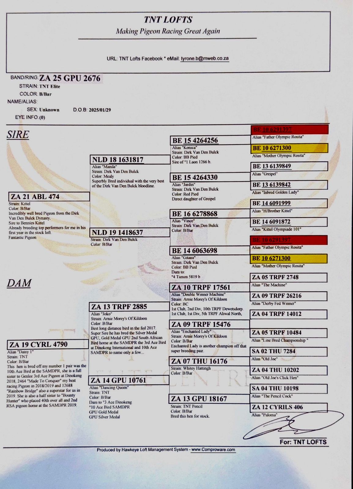 LOT 20 SAIPR SUMMER AUCTION 3 – Laurika & Ilze-OOA 325 2025 -SIRE:ZA 16 CYRILS 2895 Alias “SON SANPO GOLD” Strain: OUT OF AFRICA ACES Color: Cheque Pied KEEP IN STOCK.ZA CYRILS 2895/16 – Sire to Winner- 1st Club, 3rd GPU, Reddersburg, 414km, vel 1554 Raced by NINJA LOFTS 2- Bred by OOA Lofts. Sire to ZA VPU 9470/22-Equal 1st On the drop 9th CPL Bloem Final, Prince Albert Road, 596km, vel, 1218 Bred by OOA Lofts, entered by P Emslee. Blockstock Lofts Ggsire to ZA VPU 9608/22- 10th Despatch Eastern Cape One Loft Final 607km, vel 1158——————————-DAM:ZA 25 WPU 1841 Alias “SUPER DOUBLE 264″ Strain: SUPERSPRINT 264 KITTEL LI Color: MEALY PIED ZA WPU 1841/25-” SUPER DOUBLE 264′- Her dam’s 1st racer baby bred, NL 9113271/23 Dam to ZA OOA 345/25 – SAIPR SUMMER LOFT ENTRANT 2026 – 7th Final, 19th Ace Grand Averages ,Edenburg, 444km, vel 1144 Linebred to BELG 4230264/16 “SUPERSPRINT 264” Sire to NL 1848806/17 Sire to SUPERBREEDER COCKS OF ALWYN BESTER 63384 AND 63390- Sire and grandsire to SUPERSPRING KITTEL 264 – Double Great.SEE PEDIGREE!!!!