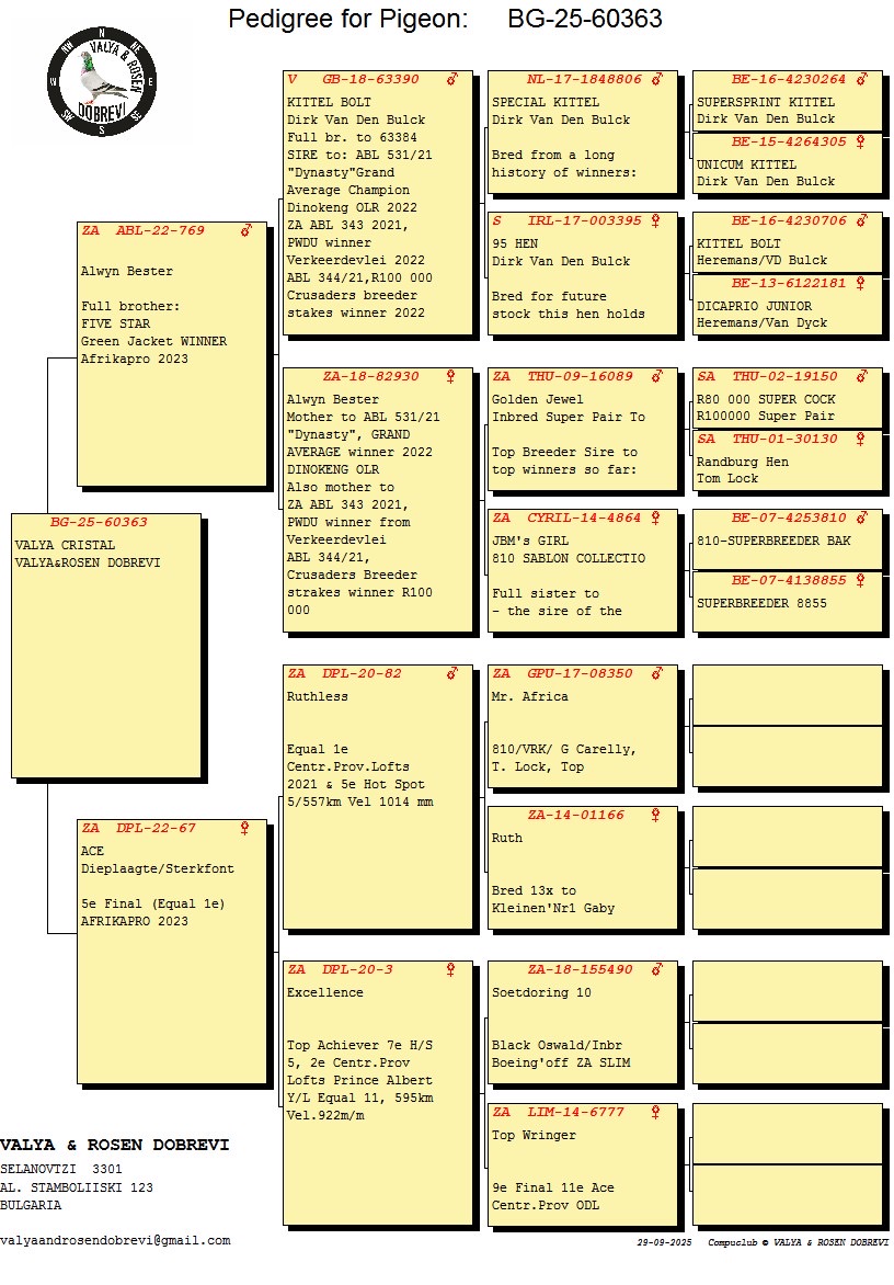 LOT 50 AFRIKAPRO AUCTION 2 -R.A.M ANNANDALE-ZA-24-BPFD-4854 -29.BLUE JACKET, 59.BROWN JACKET, 181. GREEN JACKET—-“LEADING LADY” SIRE FULL BRO TO: “MARIUS” SIRED SUPER HEN =>:”SALVO ROSE”SOLD FOR R550 000——–SIRE:ZA BPED-22-2844 C “VIKTOR”.R.A.M Annandale TALENTED RACER =>: 6. FED 570KM 1240MPM –TOP BREEDER =>: 1.BPF FED 378KM’25 3.BPF FED 488KM’25 10.ACE BPF 0.B’25 29.BLUE JACKET 2025 54.AFRIKAPRO FINAL25 59.BROWN JACKET 2025 ***FULL BRO TO:=>*** SUPER COCK “MARIUS” SIRE TO: “SALVO ROSE” 2. BROWN JACKET 2025 10.FINAL AFRIKAPRO 601KM 1.653p 1132MP—————DAM:ZA BPFD-23-1084 H “1084” R.A.M Annandale Blue Bar –TALENTED RACER =>: 12. FED 520KM 1159MPM 27.FED 488KM 1303MPM 31. FED 568KM 1494MPM 31. FED 598KM 1296MPM 31. FED 283KM 1297MPM 33. FED 336KM 1305MPM . SEE PEDIGREE!!!