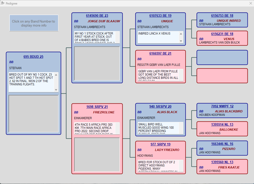 LOT 63 CAPETOWN LOFTS – Riaan Louw Team Vision 2-ZA-BDUD-25-694### -SIRE:6145670 BE 23. STEFAAN LAMBRECHT/VAN DEN BULCK.———–DAM:04711 ZA GPU 17.TOM LOCK CROSS.THIS IS MY BEST STOCK HEN EVER. SHE BRED ME 4 BABIES IN 2023. ONE IS TRIPPLE FEDERATION WINNER AND 2 TIME TRUCK WINNER. TWO SISTERS ARE TRUCK WINNERS TOO. THE BROTHER IVE PUT TO STOCK AFTER 3 SISTERS ALL..SEEPEDIGREE!!!!