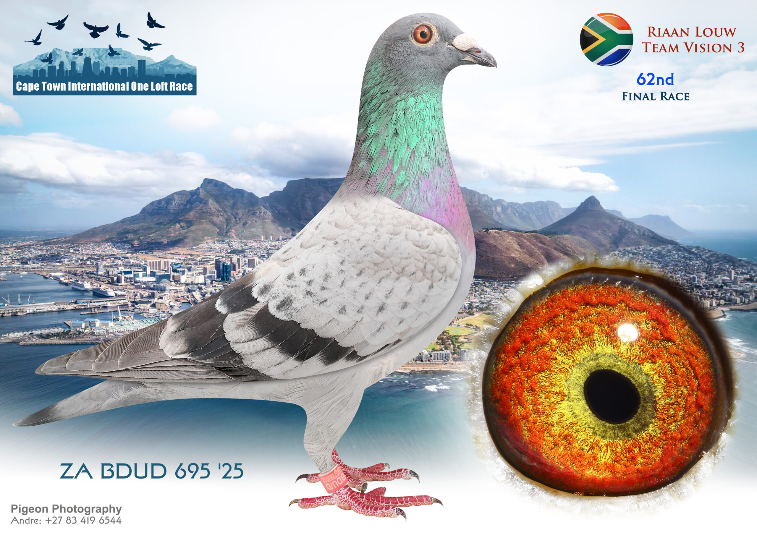 .LOT 6 CAPETOWN LOFTS – Riaan Louw Team Vision 2-ZA-BDUD-25-696### -6TH FINAL RACE R15 000.00—-7TH ACE BIRD——SIRE:6145670 BE 23. STEFAAN LAMBRECHT/VAN DEN BULCK.———–DAM:04711 ZA GPU 17.TOM LOCK CROSS.THIS IS MY BEST STOCK HEN EVER. SHE BRED ME 4 BABIES IN 2023. ONE IS TRIPPLE FEDERATION WINNER AND 2 TIME TRUCK WINNER. TWO SISTERS ARE TRUCK WINNERS TOO. THE BROTHER IVE PUT TO STOCK AFTER 3 SISTERS ALL..SEEPEDIGREE!!!!