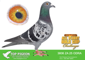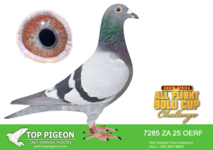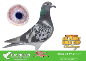 LOT 16 CARNIVAL ALL FLIGHT GOLD CUP -Andre & Juan-OERF 25 7248 -3RD HOTSPOT 1———-SIRE:ZA 24 ODRA 22783 .Alias “Tom Thumb” He was bred from proven breeders and looking at all the performers in his lineage he should breed superior birds.Sire in first year to the 3rd place Hotspot (1) Carnival summer 2026.———-DAM: ZA 21 ODRA 6706.Alias “Carcirelly`s Ace” The organization winner on 520 km and 1250 velocity on 30/7/2022. She scored 9 times top in the 2023 season. The same Machine as her g/dam. She was 6th Ace again in Combine 2023.The dam to 3rd place Hotspot.(1) Carnival summer 2026.SEE PEDIGREE!!!