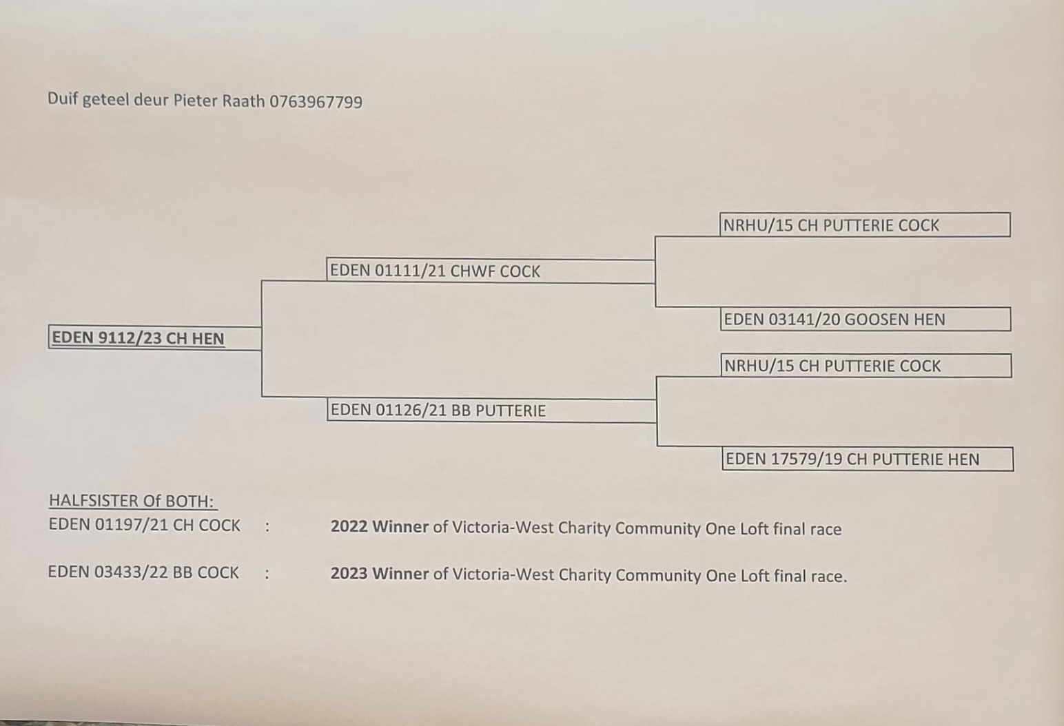 .LOT 8 WACKY WEDNESDAY – HENK ACKERMANN-1239 BORD 2024 -SIRE:3578 ZA CYRL 23 Genetic Index: BBP Bred by TNT Lofts Manuel & Zietsman Team 2 22e Final, 23e Averages * Cape Town International OLR 2023. Combination of Proudly South African Genetics with an Extra-Ordinary Hit-Rate in O/Day Lofts & Home Lofts. All Distances & Speed.———-DAM: ZA 23 EDEN 9112 —-2024 Yearlings 9th PA Final CPL.SEE PEDIGREE!!!