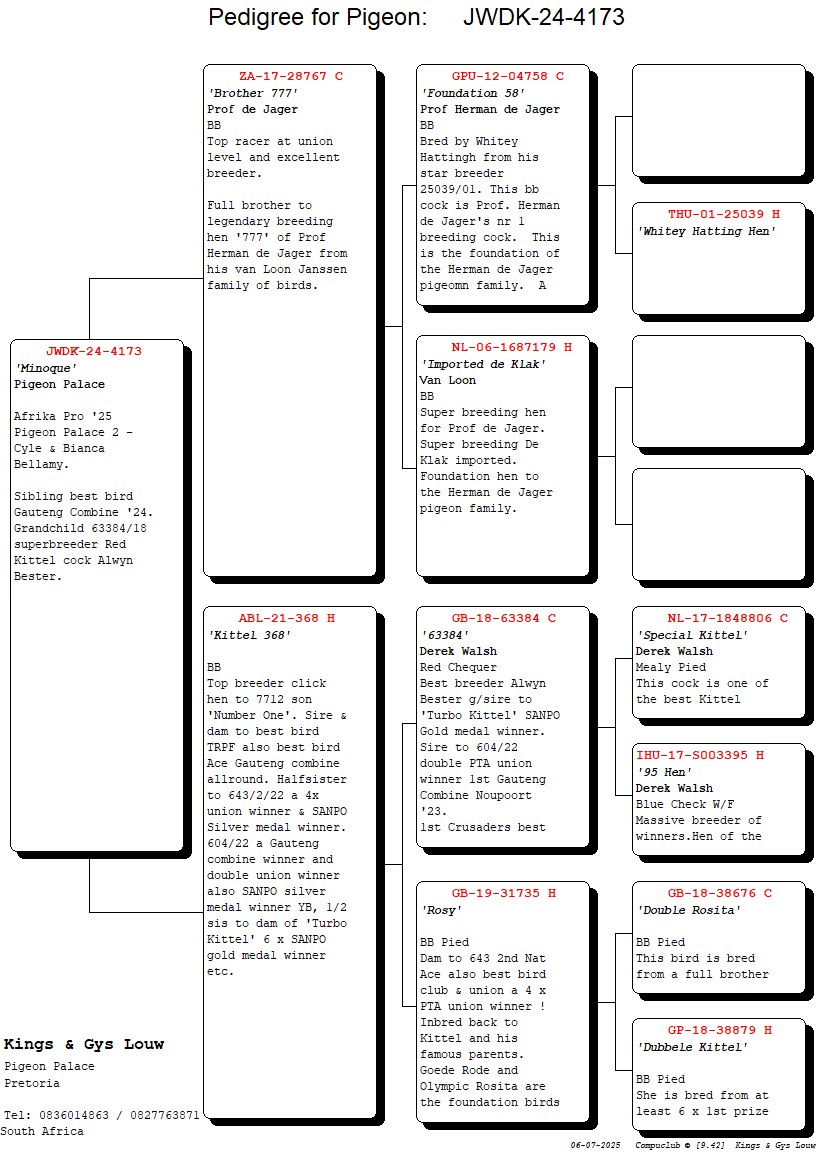 LOT 65 AfrikaPro Auction 2B – Pigeon Palace 2 – ZA-24-JWDK-4173 -90TH FINAL , RACE 7 EQUAL WINNER———SIRE:28767 ZA 17.Alias “‘Brother 777′” Strain: Prof H De Jager Color: BBAR Magnificent racer beating his sister ‘Superstar 777’ in their first year of racing. Put to stock by Prof de Jager and is one of only 8 stock cocks used in his breeding program.———DAM: ZA 21 ABL 368 “ABL KITTEL”. HALF SISTER TO MOTHER OF SANPO GOLD MEDAL WINNER 2021 ALLROUND “TURBO KITTEL”. INBRED TO FAMOUS KITTEL 1ST NATIONAL ACE KBDB 2013. THIS HEN IS DAM TO A SUPER RACER AND WINNER FOR GYS & FORMYN IN THE STRONG TRPF. SEE PEDIGREE!!!