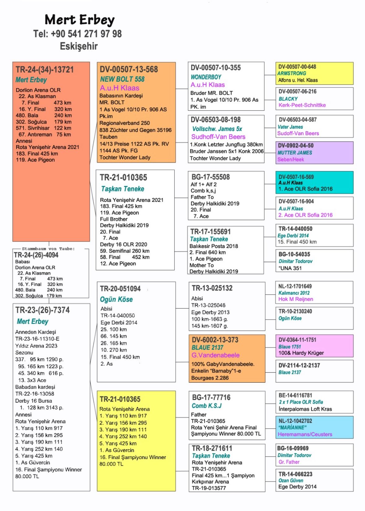 LOT 98 AFRIKAPRO AUCTION 1 – Ahmet Çavdar-TR-24-34-19205 -SIRE:IF-2021-AFL-430 SON OF ORNAT.One of the best OLR breeder in WORLD ORNAT HIM SELF WON: 1st Car Average Winner. 61st Car Race 2-3500 Bird. 22nd Car Race 3-3338 Bird.———–DAM:BE 23-4181868 DHT OLYMPIC GUSTAVE XIV.Original PIPA Breeding DNA Certified. SIRE IS SUPER RACER! Unique performer with the lowest % ever Olympiad Sprint Belgium, winning: 1. Olympiad Belgium Cat A 24 1. Nat. Ace KBDB Sprint 2023 6. Nat. Ace KBDB Sprint 2022 (Behind 1-2.-3.-4. Nat Ace KBDB Sprint with BK family) Winner of 14 (1) X 1. against av. +1.000 p..SEE PEDIGREE!!!