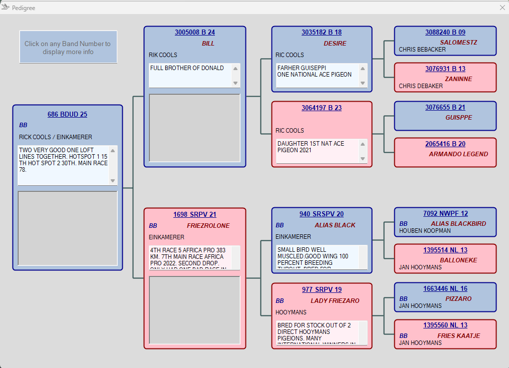 .LOT 9 CAPETOWN LOFTS – Kosie & Kassie-ZA-BPPD-25-1247*** -9TH FINAL RACE———–SIRE:ZA-2024-KAROO-9 Petrie Maree De Rauw Sablon Blue Father to: • 9e Final Cape Town Int. Summer 2026. • 23e Ace Cape Town Int. Summer 2026. • 28e Hotspot 4 Cape Town Int. 2026. ==================================DAM:ZA-2024-KPU-2230 “MOLTMAR” Stear Painter Blue “Moltmar” is half-sibling to “Long Gold” • Sanpo Gold Long Dist. 2022. “Moltmar” was a very promising prospect at Saipr Summer 2025 scoring 6e and 10e (both times equal 1e) on training flights before returning injured from Hotspot 1. She is a directly bred from “Molteno” The mother to our: • 1e Nat. Ace Sanpo Gold Long Dist. 2023. Also mother to our star “Hot Chocolate” “Molteno Hen” has bred multiple winners, Union winners and Ace pigeons etc. too mention here – suffice to say that she is a true super breeder! The father of “Moltmar” is a super young cock that we handpicked for our breeding loft..SEE PEDIGREE!!!