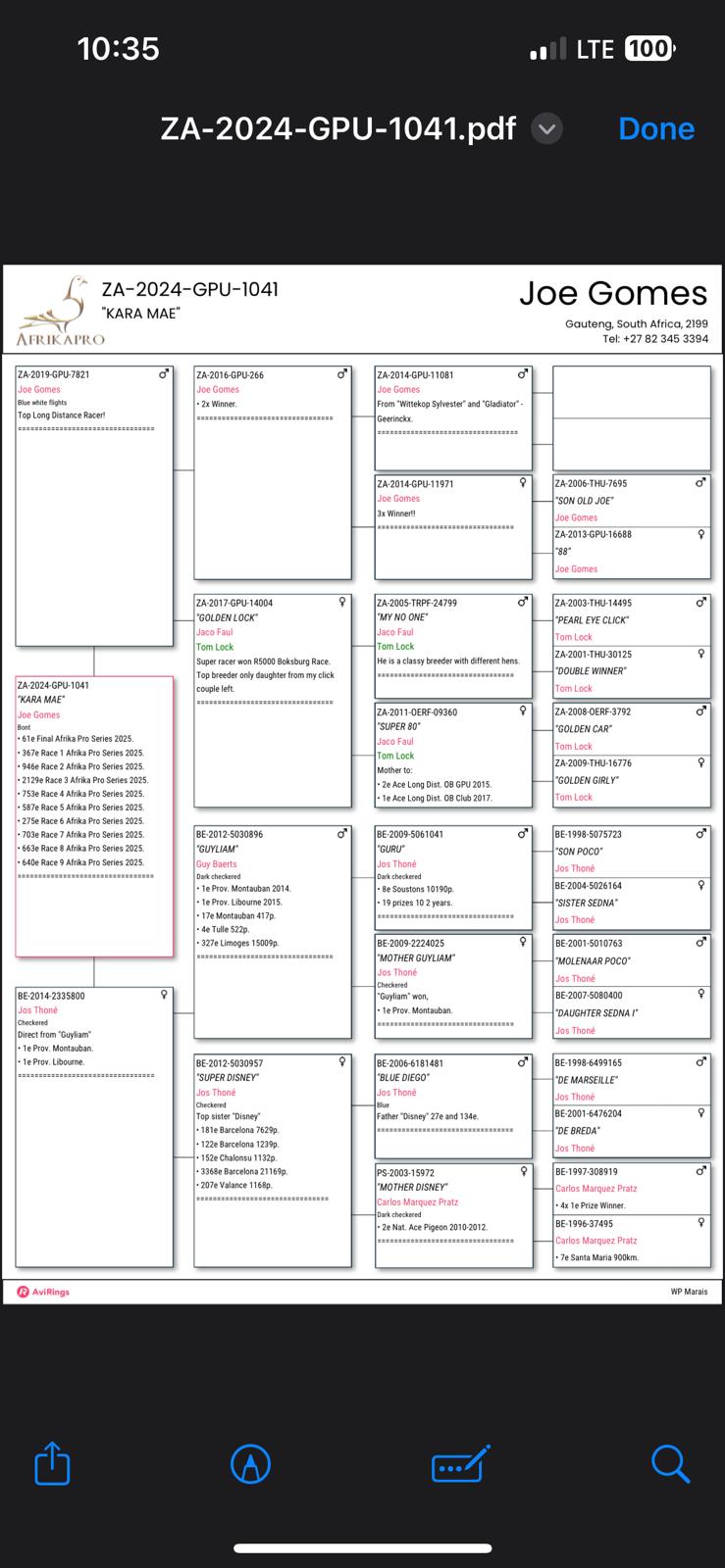 LOT 98 AFRIKAPRO AUCTION 5 -Ganus Family Loft 2-ZA-24-FFL-037 -RACE 3 EQUAL WINNER———-SIRE:163 ZA 19 DVNH . DOUBLE GRANDSON TO SUPERBREEDER 810.————–DAM:84 ZA 22 BOTH. Alias “Coco” Strain: Du Preez&Deetlefs Color: MEALY Dinokeng 2023 8th Final. SIRE IS Full Brother to Turbo Kittel- Best Bird South Africa 2021.Race 724km 1493mpm 26th Barzalona 724km 1449mpm 84 is Dam to Afrika Pro 2024 – 25/1813p 430km , 15/2236p 201km , 6/2230p 240km , 31/1813p 430km – 2 x equal 1st.SEE PEDIGREE!!!