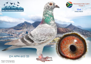 LOT 42 CAPETOWN LOFTS – Pennington Loft Team 1 – ZA-NPN-25-6135### -SIRE: 10581 ZA 21 GPU .Alias “Rocket Pocket” Color: Blue Bar 32nd Grand Average winner. 20th Hotspot ACE pigeon. Same way bred as ZA GPU 8778 – 22 Jey Dynasty, 2nd Matjiesfontein Challenge winning R50000.00. Sold for R19500.00.———-DAM: 9 ZA 22 DPL .Strain: Laureraat / Dijkstra Color: Blue Check 27TH Final.- 17TH ACE BIRD.- LAUREAAT COOREMAN.—- Sire: ZA DPL 1-20. Grand Sire. LD Genes from Thomas Smit. Br ‘Laureaat 2500’ Sired 3 Prize Pos. VFWCR./ D Demko, Dr Carlo Gyselbrecht, Marc Roosens Extra LD A Vanbruaene 2x 1e Barcelona Samdpr Scores from this Line: 3e, 14e, 18e, 19e, 20e, 39e, 44e, 53e, 114, 124e, 129e Etc. 2014- 2020. Grand Dam. 3e & 7e HS 2 & 4 / Equal 1e 8e F 5e Ace Carnival Summer inbr . Niece ‘Silver Flash’ 1e & Ace Bird.—- Dam: ZA 20 GRPF 2113. 3e H/Spot (2) 7e H/Spot (4) Both Equal 1e / 8e Final .SEE PEDIGREE!!!