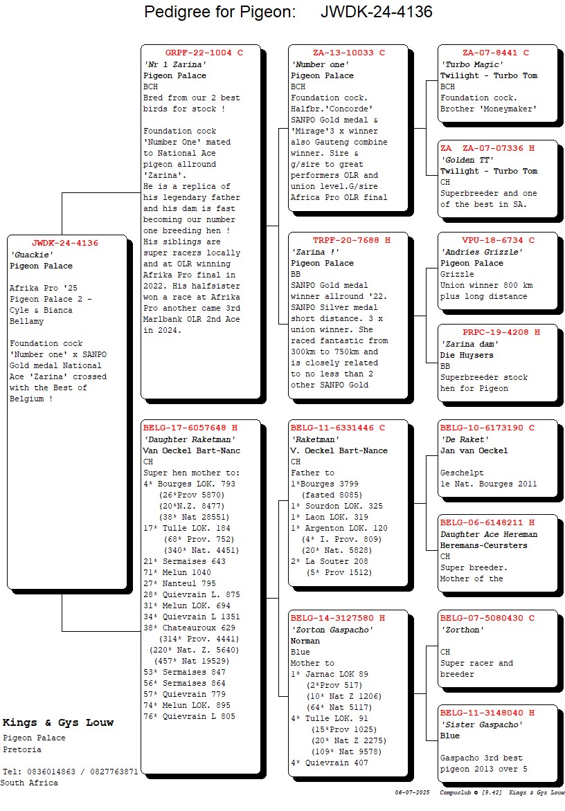 .LOT 7 AfrikaPro Auction 2B – Pigeon Palace 2 – ZA-24-JWDK-4136 -SIRE:GRPF-22-1004 C ‘Nr 1 Zarina’ Pigeon Palace.Bred from our 2 best birds for stock !Foundation cock ‘Number One’ mated to National Ace pigeon allround ‘Zarina’. He is a replica of his legendary father and his dam is fast becoming our number one breeding hen! His siblings are super racers locally and at OLR winning Afrika Pro final in 2022. His halfsister won a race at Afrika Pro another came 3rd Marlbank OLR 2nd Ace in 2024.———–DAM:BELG-17-6057648 H ‘Daughter Raketman’ Van Deckel Bart-Nanc CH Super hen mother to: 4 Bourges LOK. 793.SEE PEDIGREE!!!