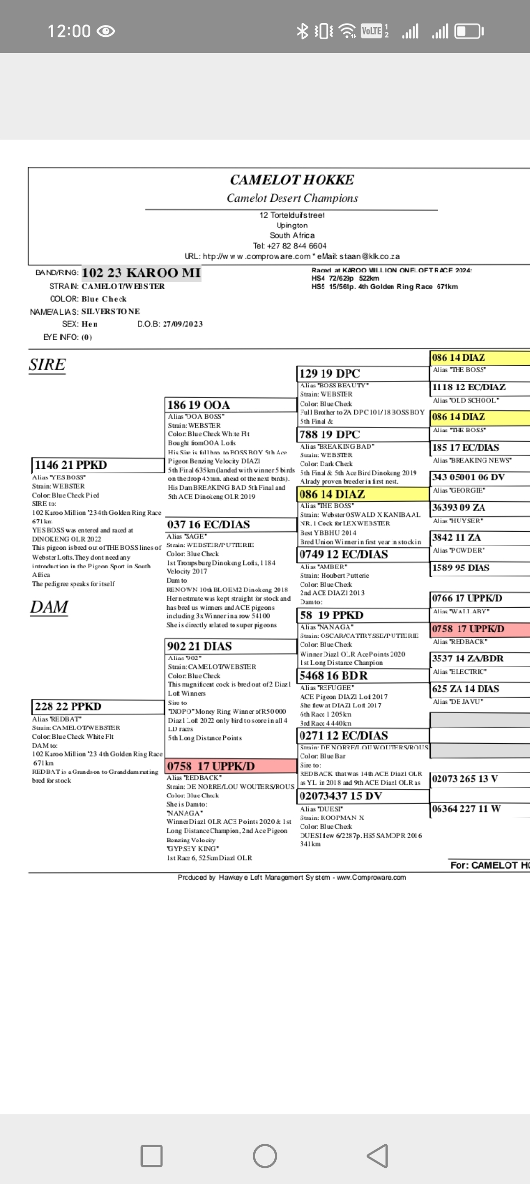 .LOT 7 ANDRE ERASMUS “TSUNAMI LOFTS” – 102 KAROO MIL23 -4TH GOLDEN RING RACE ———SIRE: 1146 21 PPKD . Alias “YES BOSS” Strain: WEBSTER Color: Blue Check Pied SIRE to: 102 Karoo Million ’23 4th Golden Ring Race 671km YES BOSS was entered and raced at DINOKENG OLR 2022 This pigeon is bred out of THE BOSS lines of Webster Lofts. They dont need any introduction in the Pigeon Sport in South Africa The pedigree speaks for itself.—————DAM:228 22 PPKD. Alias “REDBAT” Strain: CAMELOT/WEBSTER Color: Blue Check White Flt DAM to: 102 Karoo Million ’23 4th Golden Ring Race 671km REDBAT is a Grandson to Granddam mating bred for stock.SEE PEDIGREE!!!!