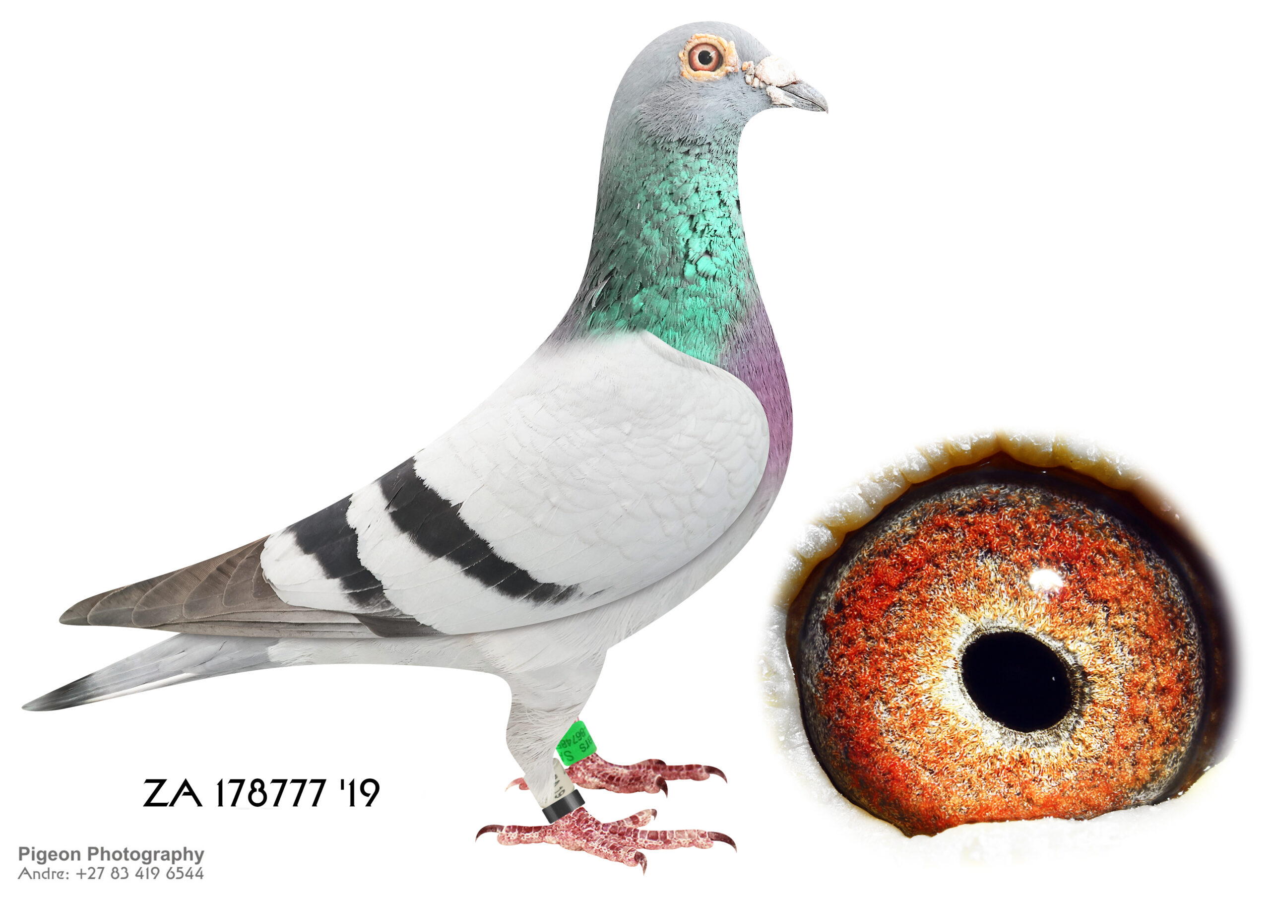 LOT 25 CORRIE NAUDE – ZA 20 TRPF 4858 -SIRE:29737 ZA 15.Sanpo Gold Medal Pair The father is Seabiscuit who was the SANPO Gold Medal winner. The best bird over all distances. Mated to Hetti. One of the best Million Dollar Race pigeons, bred out of Gabi Vandenabeele bloodline. The legendary Wittenbuik cock in Belgium.———DAM:3036 ZA GPU 18 Gold Medal BBPD Sanpo Gold & Silver Medal Pair Short Dis The Sire of this hen is a Spritzie Jansen Cock and 3 x winner. Best pigeon in the WRRPA and one of the SANPO Gold Medal Short Distance winners. The Dam of this hen is my SA National Pigeon Organisation Silver Medal Winner Short distance 2013.SEE PEDIGREE!!!!