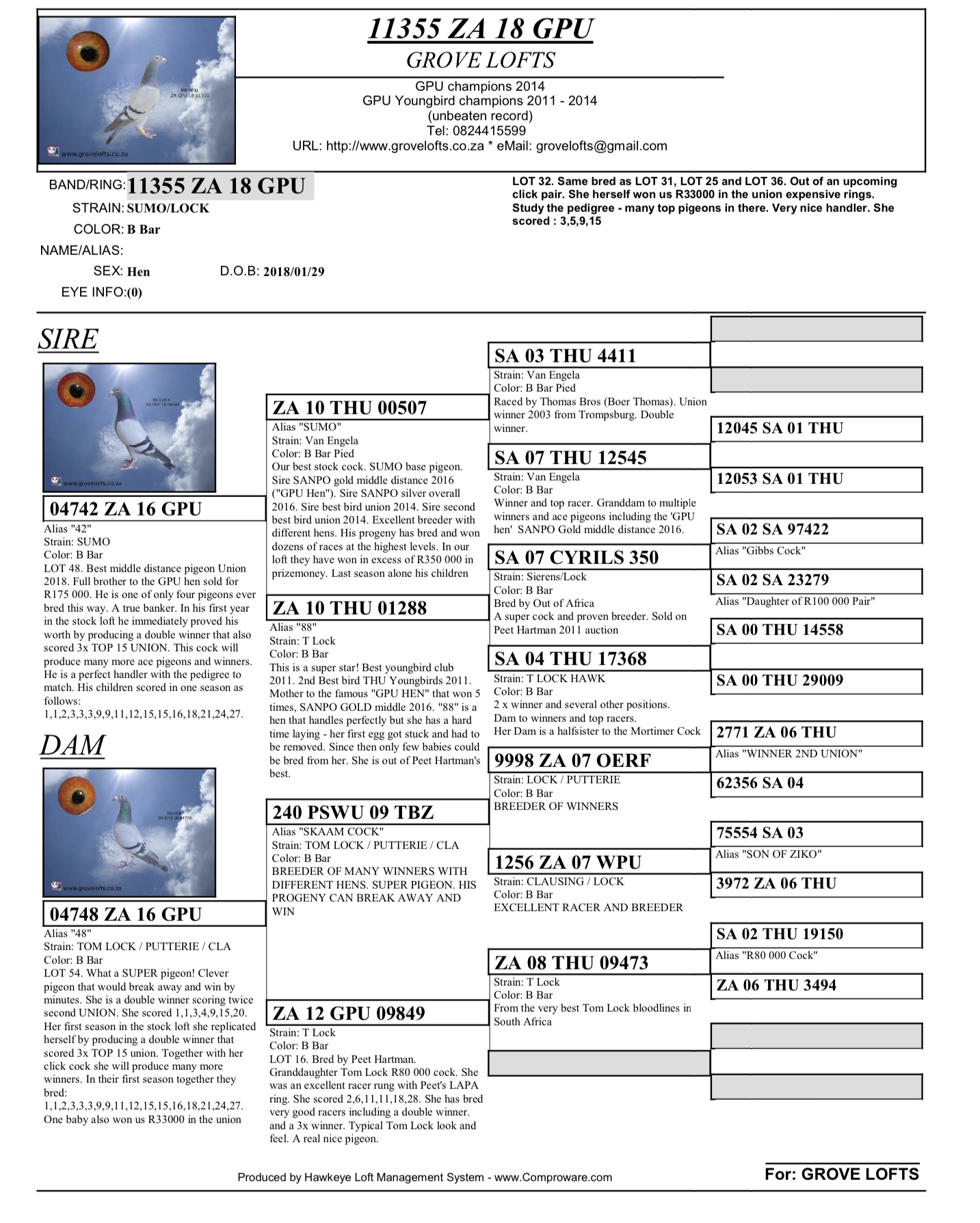 .LOT 7 MIKE ENGELBRECHT – ZA 25 ME BULLCAT 147 -SIRE:ZA 24 OP 12310.GREIPEL/KITTEL/LEO HEREMANS. THIS IS BRED FROM THE BEST GENETICS AROUND THE WORLD.———–DAM:11355 ZA 18 GPU.SUMO LOCK. Out of an upcoming click pair. She herself won us R33000 in the union expensive rings. Study the pedigree – many top pigeons in there. Very nice handler..SEE PEDIGREE!!!!