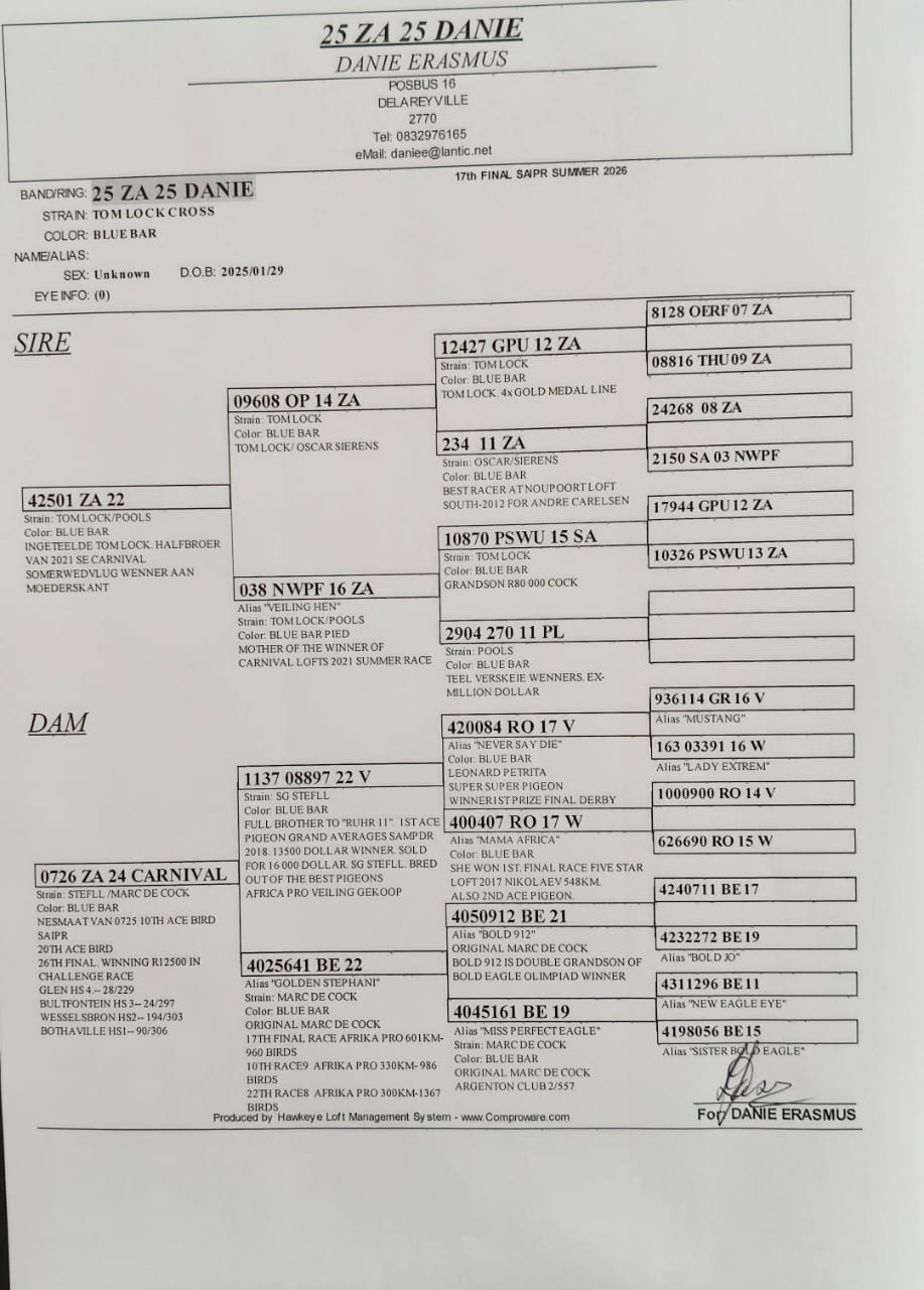 .LOT 7 SAIPR SUMMER AUCTION 1 – Danie Erasmus 2- DANIE 25 2025 -17TH FINAL RACE WINNING R15 000.00———–SIRE:ZA 22 42501. TOM LOCK CROSS. HALF BROTHER TO CARNIVAL WINNER 2021.——-DAM:0726 ZA 24 CARNIVAL LOFTS. STEFFL/MARC DE COCK. 20TH ACE BIRD AND NESTMATE WERE 10TH ACE BIRD SAIPR 2024.SEE PEDIGREE!!!!