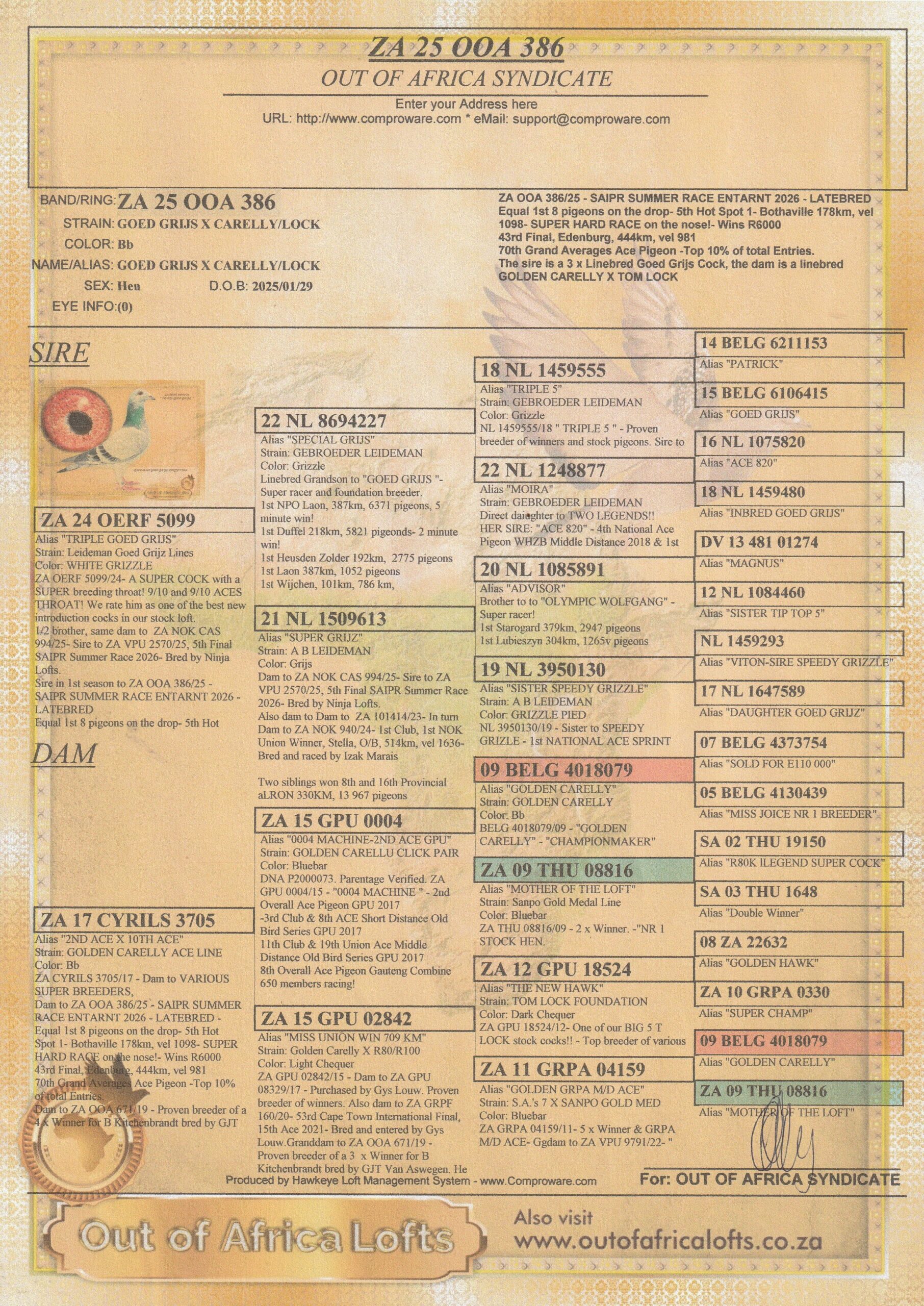 LOT 70 SAIPR SUMMER AUCTION 1 – OOA & RVV 1- OOA 386 2025 -5TH HOTSPOT 1 EQUAL WINNER————SIRE:ZA 24 OERF 5099 Alias “TRIPLE GOED GRIJS” Strain: Leideman Goed Grijz Lines Color: WHITE GRIZZLE ZA OERF 5099/24- A SUPER COCK with a SUPER breeding throat! 9/10 and 9/10 ACES THROAT! We rate him as one of the best new introduction cocks in our stock loft. 1/2 brother, same dam to ZA NOK CAS 994/25- Sire to ZA VPU 2570/25, 5th Final SAIPR Summer Race 2026- Bred by Ninja Lofts.————–DAM:ZA 17 CYRILS 3705 Alias “2ND ACE X 10TH ACE” Strain: GOLDEN CARELLY ACE LINE Color: Bb ZA CYRILS 3705/17 – Dam to VARIOUS SUPER BREEDERS,SEE PEDIGREE!!!!