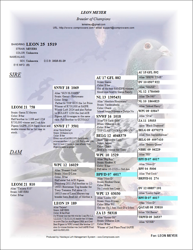 LOT 36 MARLBANK OLR – FEATHER LOFT-ZA-24-NDK-1074 -SIRE:1767 WRRPA 15 ZA.Alias “Sven” St rain: Van Loon Cross Color: Blue Bar 1st Union Verkeerdevlei Open 2018 2nd Union Smithfield YB 2017 6th Union Verkeerdevlei Open 2016 Father of 3 t ime winner. (3966 – 16).———-DAM:41 NDKO 21 ZA.St rain: De Klak Janssen Color: Blue Bar 22nd Best Bird Sprint WRRPA 2021 9th Best Bird Sprint NDK 2021 2022: 31st Best Bird NDK Club Combine co-winner Colesberg: 2023: 1ste Beste duif in die klub 2023. 18th Best open bird WRRPA 2023. 14th Best open bird GWC 2023.SEE PEDIGREE!!!