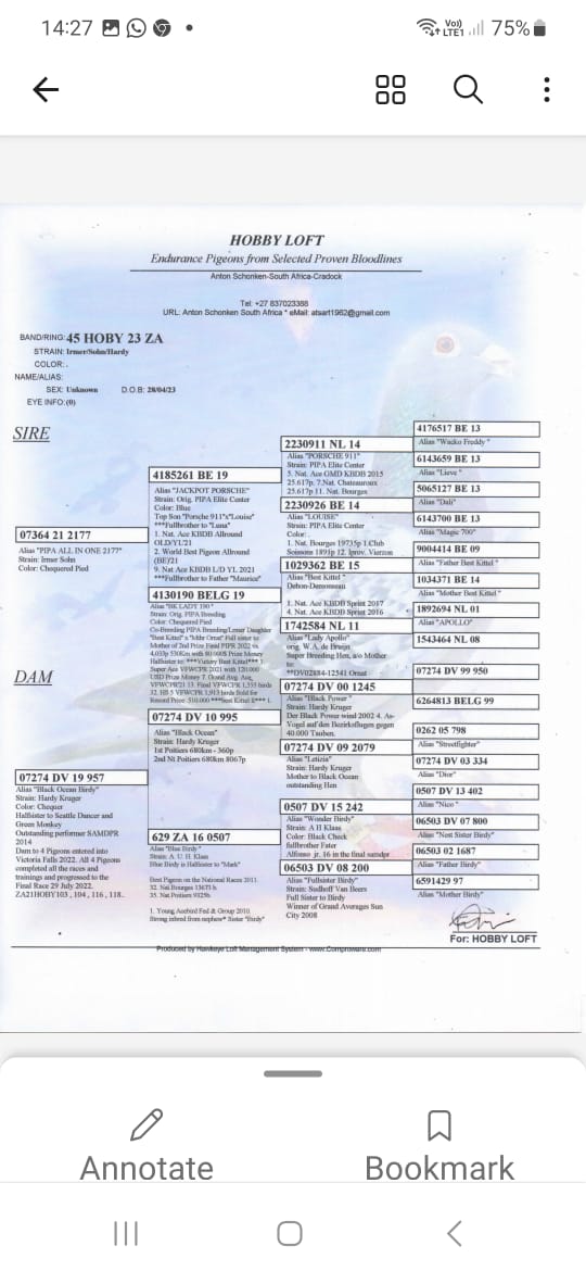 LOT 43 SAIPR SUMMER AUCTION 1 – Len Knoetze 1- BHPS 265 2025 -9TH ACE BIRD———–SIRE:24377 ZA TRPFD 13 ‘Birdy ’77’ Colour : BBWF Son ‘Terry’ x ‘Birdy’ Direct Son of ‘Birdy’ when mated to German Ace Racer & Gold Medallist ‘Terry’ Combination of World Class racers & breeders from the SüdhoffVan Beers Foundation Premier gene pool around the Globe. Super Stock from Johan Hamilton bought from Mark Kitchenbrand’s Lofts at High Expense. OL Money Winner.—————-DAM:4429 ZA GPU 15 ‘Super Flor’ – ‘Die Kuier Hen’ Colour: BB Racing Silverbacks.Scored 7x in the Top 100 TRPF (Racing Silverbacks Flor Engels). She Clicked with 2 Cocks interalia Super Breeder with Witpen Hokke Gold & Silver Medallist OERF Fed 1e Ace S/Dist / 2e Ace All Dist. Inbr EGG Cock (Juan 1’, ‘The Rock’, Dght ‘Moneymaker’, 1x cross ‘De Sierens’) and She also ‘Clicked’ with 01077- GPU 17 Kaasboer / ‘Chipo’ Cock from GJT & Benchmark Lofts, Billy Kitchenbrand.SEE PEDIGREE!!!