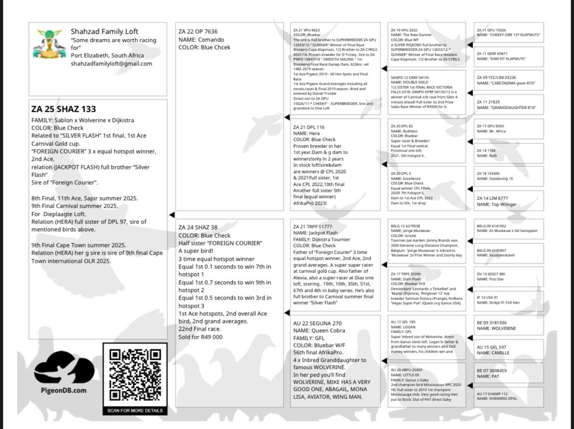 LOT 25 CARNIVAL ALL FLIGHT GOLD CUP -Hillcrest Stud 2-HILLCREST 25 69 -Winner of 3rd Place Carnival Gold Cup 2025/2026 winning R50,000 Winner of 3rd Placed Ace Bird winning R20,000——–SIRE:ZA24 Hillcrest 003 NAME: Hillcrest Secret SEX: cock COLOR: Bleu Bar Pied Entered into Carnival Winter OLR. Full Brother to 5th Carnival Winter 2021 Full siblings have already excelled at different one loft races. Hillcrest Nico Entered into Sonskyn OLR 11th Final & 1st 2023 bred bird to be clocked.————–DAM:ZA 24 Hillcrest 076 SEX: hen COLOR: Grizzle Retained for Stock. Half Sister to the sire of Lauri, 3rd Final Carnival Gold Cup 2024 Half Sister to the Dam (ZA22 BPPD 3020) of 1st Marlbank Final 2024 Dam to HILLCREST HARD HEART 3rd Final Carnival Summer 2026 2nd Ace Bird.SEE PEDIGREE!!!!