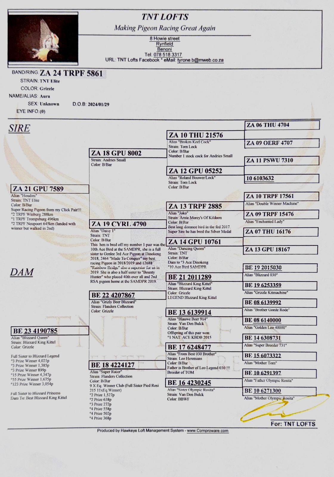 .LOT 1 AFRIKAPRO AUCTION 5 – Jort Batenburg-NL-24-8398662 -20TH RACE 8———–SIRE:BE22-4041656 Blue BK X Shakira.Very promising young breeder. His first child bred for racing “040-23”, went to Les Green in the UK and won a.o. 1. Comb. Mangotsfield vs 878 b. 4. Comb. Cheltenham vs 1.296 b.———-DAM:NL21-1177414 Daughter Jef X Lieve.DAM IS BE13-6143659 LIEVE, DHT GLADIATOR PIPA Elite Center Or. Geerinckx -3 Generations are winners of:- 3x 1.Olympiad bird 2022 1. Nat Ace KBDB LD YL 2021 1. Nat Ace KBDB Allround 2021 1. Nat Ace KBDB LD YL 2023 2,2,2,3,3,4,4,5,5..Nat Ace KBDB 1. Nat Bourges.SEE PEDIGREE!!!!
