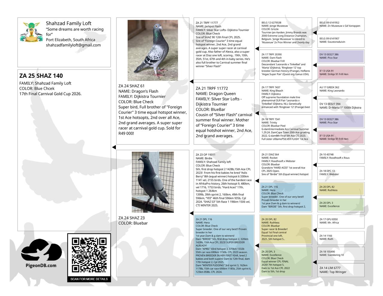 LOT 79 CARNIVAL ALL FLIGHT GOLD CUP -BJA Lofts-SHAZ 25 140 -SIRE:ZA 24 SHAZ 61 NAME: Dragon’s Flash FAMILY: Dijkistra Tournier COLOR: Blue Check Super bird, Full brother of “Foreign Courier” 3 time equal hotspot winner, 1st Ace hotsopts, 2nd over all Ace, 2nd grand averages. A super super racer at carnival gold cup. Sold for R49 000!————DAM:ZA 24 SHAZ 23 COLOR: Bluebar.SEE PEDIGREE!!!!!