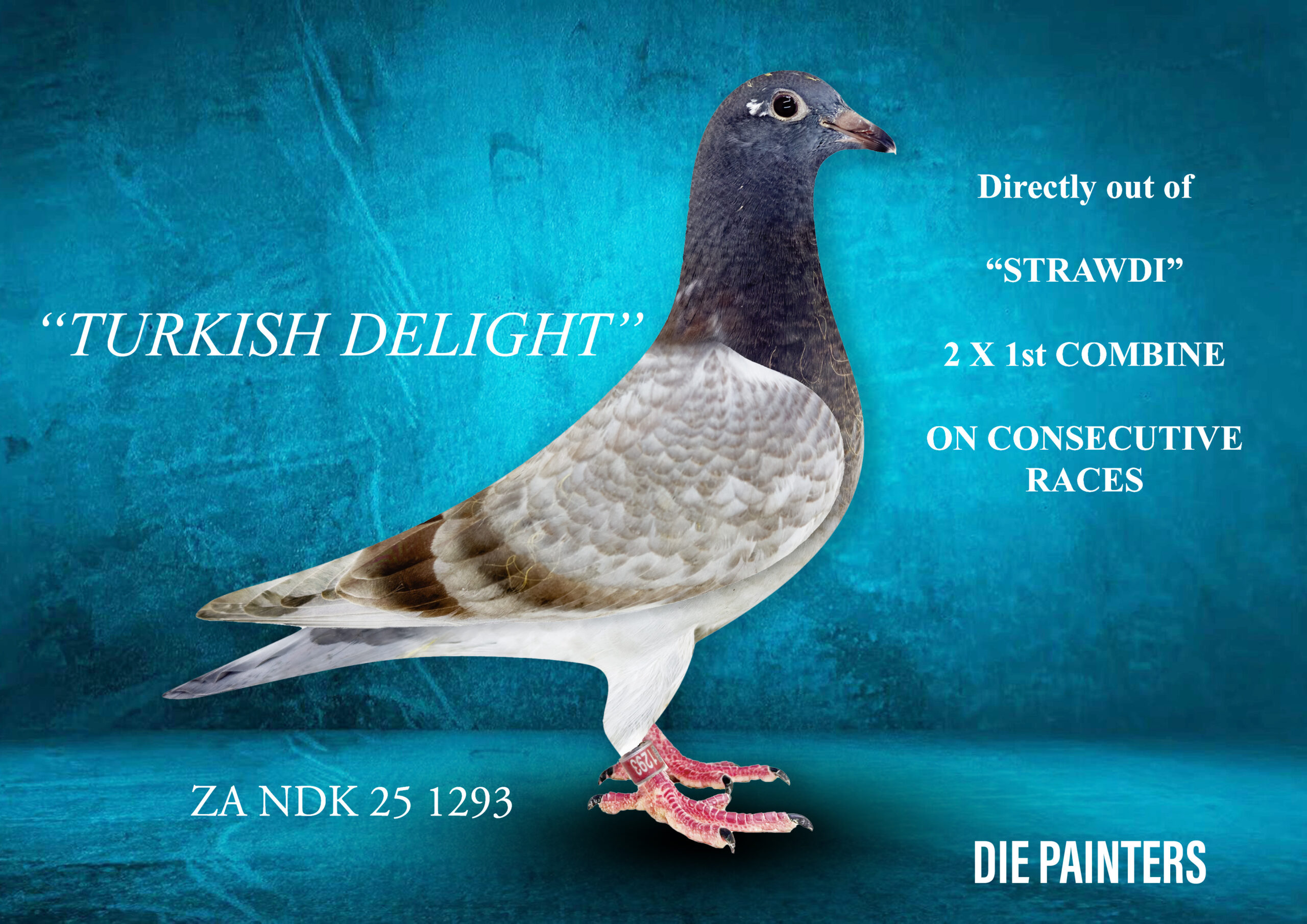 .LOT 8 DIE PAINTERS – ZA 25 NDK 1293 “TURKISH DELIGHT” – Painter Indigo Bar Directly out of The famous “STRAWDI” is a 3 X Combine Winner & Sales Race Winner. She won 2 X 1st Combine in the space 7 days from 589km & 654km vs more than 1200 pigeons on each occasion. Bred from a proven pair. Father is bred by Ahmet Cavdar from Turkey. He is widely respected as owning one of the best collections of modern performance pigeons. He is bred out of a son of the worldfamous “ORNAT” when mated to a daughter of the equally famous “OLYMPIC GAUSTAVE” – fresh super performance genetics!SEE PEDIGREE!!!!