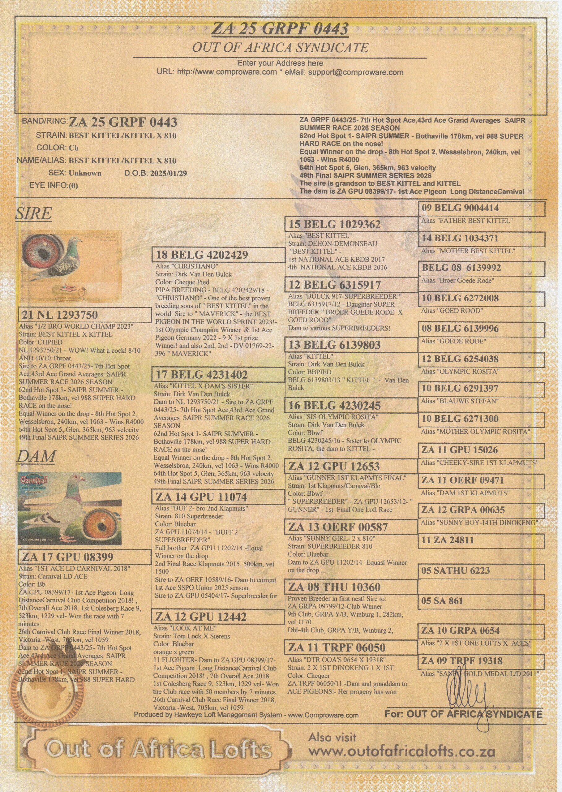 .LOT 1 SAIPR SUMMER AUCTION 1 – Greg Anderson 1- GRPF 3495 2025 -6TH FINAL RACE WINNING R50 000.00—-NESTMATE TO CARNIVAL SUMMER 2026 FINAL RACE WINNER AND 1ST ACE BIRD————SIRE:366 TRPF 24. HARRY WILLSON. JELLEMA / GANUS. 5TH FINAL CARNIVAL SUMMER 2025. 3RD ACE BIRD CARNIVAL SUMMER 2025.————-DAM:037 HILLCREST 24 HILLCREST HYPE GRIZ 4TH PLACE CARNIVAL GOLD CUP 2025, WINNING R40 000, 4 MINS ,11 SECONDS BEHIND THE WINNER , 2ND ACE BIRD FROM INITIAL ENTRY OF 337, WINNING R15 000.SEE PEDIGREE!!!!
