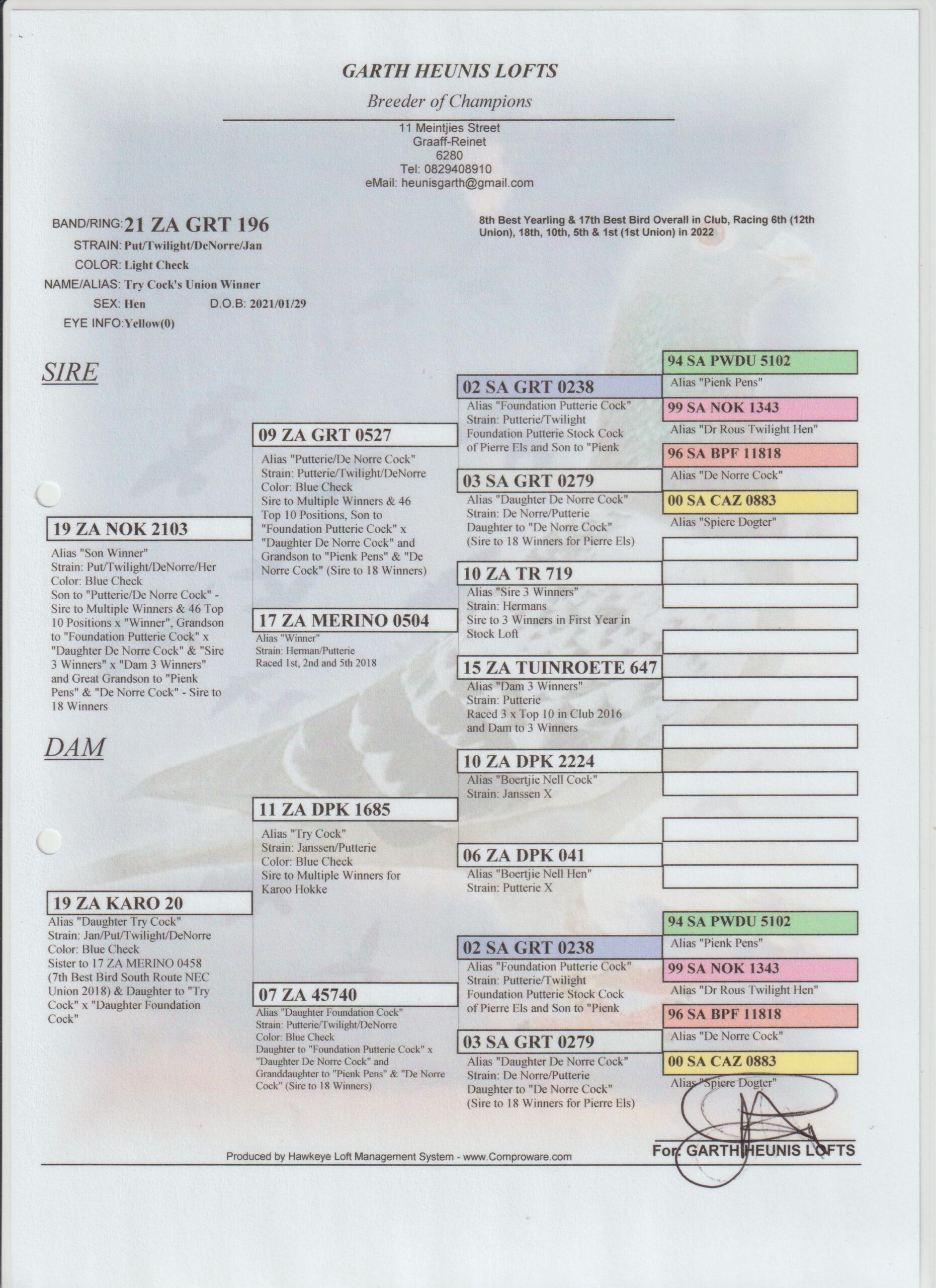 .LOT 1 R500 BARGAIN BOX – ZA 22 MID 7414 BCH – BRED FROM CLICK PAIR – SIRE: 65841 ZA 08 “THE BEST FOR LAST” . ROCKY/SPRITZY. THIS IS THE CLICK COCK OF PIETER VAN ZYL.—–DAM: 1179 11 ZA “CLICK HEN 16 X WINNER). ROCKY / SPRITZY. 16 X WINNER. 2 X UNION WINNER. BRED 3 SONS THAT WERE BEST BIRD IN UNION. DAUGHTER 0753 WON UNION AND SALES RACE AND WINNING R128 000.00. PIETER VAN ZYL’S NR 1 BREEDING HEN. SEE PEDIGREE!!!