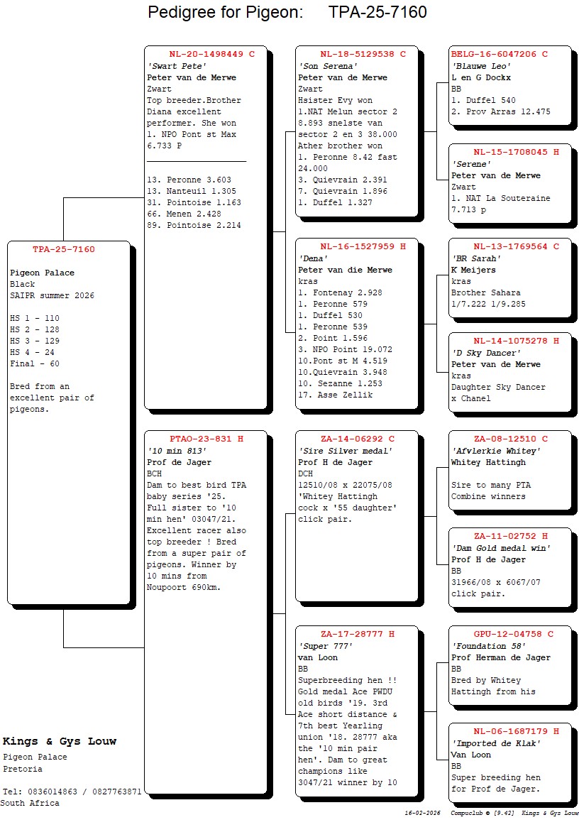 .LOT 4 SAIPR SUMMER AUCTION 1 – Len Knoetze 2- BHPS 263 2025 -2ND HOTSPOT 1 EQAUL WINNER , 7TH HOTSPOT 3 EQUAL WINNER———-SIRE:112 ZA PPL 22 ‘Blue 112’ Colour : BB Kruger Lofts Gold at its Best Best of the Foundation of the Gaby’s Bertus Nel sourced from key birds of Belgium, The Netherlands, the UK & Wales. / Br’s ‘Wittenbuik 790’ & 370’ of ‘Witpen Wittenbuik SA’ & the ‘Gaby Hen are both ‘Wittenbuik’. Gr.Childr / Maternal Starting ‘Marieke’ 1e Prov. Ace Fond was sold for 56000 Euro.————DAM:7316 ZA 15 ‘Ella’ BB Index 2x 1e & 4x 2e Samdpr Fred Coetzer Lofts Top Racer / Gaby Rik Cools / F Norman / H Schroyens 1e R5,000 ring race Won R70,000-00 Her Sire 1e 770Km as a YL Her Dam won 1e Union 780Km @ 5Min. Lead. Her Sire’s Parental Gr.Dam ‘Sweety’ is ½ Sist to ‘James’ Maternal Gr.Sire. Both of ‘Tina’ Dght ‘Neptunus’ Sire of ‘Spy’ 2e Samdpr G Vandenabeele / Dam of ‘Ella’s’ Sire is of ‘Abby’ Sist of ‘Sammy’ the Sire of ‘Ella’s Mother Both of ‘Dusty’ & ‘Lovey’ /’Dusty is of Nepke’ Sist ‘Spy’2e Samdpr / ‘Lovey’ Is Bred by N & F Norman related to ‘Abraham’ 1e Samdpr 2008.SEE PEDIGREE!!!