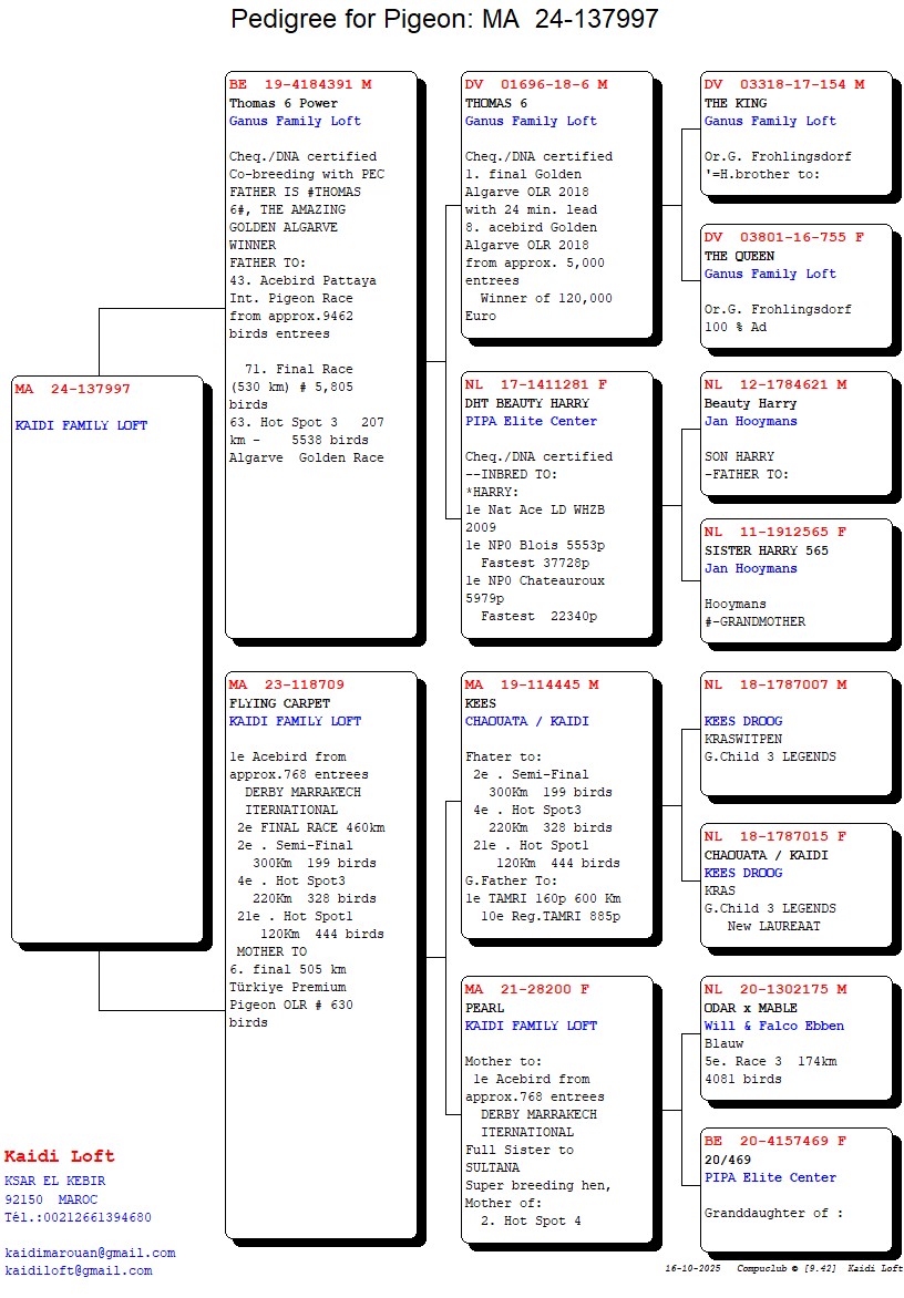 LOT 46 AFRIKAPRO AUCTION 4 – KAIDI MAROUAN-MAROC-24-137986 -SIRE:NL 21-1589010 Jelle Jellema Full Brother: 2. Best Pigeon 5 longest races PIPR / G.dght. Best Kittel 7. acebird Pattaya Int. Pigeon Race 90. Final Race Sirindhorn (530 km) 4,033 birds 149 Final Pattaya’ 23 177 Final Pattaya’22—————-DAM:BE 23-4203475 F.GUSTAVE B. BK⭑SHAKIR PIPA Breeding.SEE PEDIGREE!!!