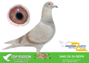 .LOT 1 DINOKENG OLR AUCTION 2 – WILLIE MUNNIK-ZA SANPO 24- 11942 (B) -76TH FINAL , 10TH RACE 4 EQUAL WINNER—————SIRE: HCC 21 ZA 1081. Strain: TOM LOCK/SAMDPR WINNING L Color: BLUEBAR EQUEL 1ST PLACE ALLFLITE SUMMER RACE 2022 SUPER GENES IN THIS PIGEON. TOM LOCK/SABLON-810-/SAMDPR WINNING LINES ACE BIRD SUMMER ODL ALLFITE 2022(AVE SPEED 946,1375MPM————–DAM; 4065 NRHU 24 ZA .Strain: KITTEL Color: BLUEBAR COMPETE IN AFRIKA PRO. 51TH FINAL RACE AND ON THE DAY BIRD.SEE PEDIGREE!!!