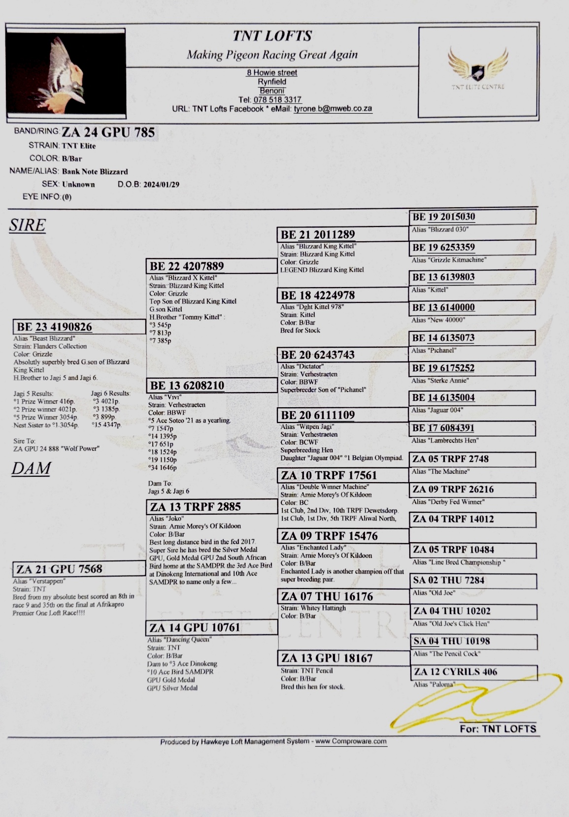 LOT 82 AfrikaPro Auction 2B – TNT Elite Centre – ZA-24-GPU-785 -SIRE:BE 23 4190826 . “BEAST BLIZZARD”. “BLIZZARD KING KITTLE GENETICS. THIS COCK IS A DIRECT GRANDSON TO WORLD FAMOUS “BLIZZARD KING KITTEL”.————–DAM:ZA 21 GPU 7568. TNT ELITE CENTRE. THIS HEN FLEW 8TH AFRIKAPRO RACE 9. SHE IS A DIRECT DAUGHTER TO LEGENDARY “JOKO” . “JOKO” IS A SUPER BREEDING COCK FOR TNT.SEE PEDIGREE!!!