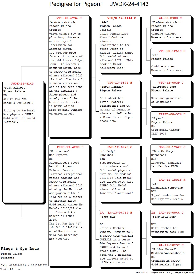 LOT 83 AFRIKAPRO AUCTION 2 -Kings & Gys Louw 2-ZA-24-JWDK-4143 -FULL SISTER TO LEGENDARY RACING MACHINE AND SUPER BREEDER “ZARINA”–SIRE:ZA 18 VPU 6734 “SIRE ZARINA”. UNION WINNER AND TOP BREEDER. AELBRECHT/BOSUA/BRICOUX. SIRE TO SANPO GOLD MEDAL WINNER ALLROUND 2022 FOR GYS LOUW. “ZARINA” 3 X UNION WINNER. THIS COCK WAS A GIFT FROM ANDRIES FIVAZ BRED FROM THE OLD BLOODLINES OF CHAMPION FANCIER GYS LOUW. ————–DAM:PRPC 19 4208 “KANIBAAL HEN”. SUPERBREEDER STOCK HEN. DAM TO “ZARINA” EXCEPTIONAL RACING MACHINE AND SANPO GOLD MEDAL WINNER ALLROUND 2022. THIS HEN IS SISTER TO ANOTHER SANPO GOLD MEDAL WINNER “MR MEDALS”. SHE IS A TOP BREEDER ESPECIALLY WHEN MATED TO GRIZZLE COCK “SIRE ZARINA”.SEE PEDIGREE!!!