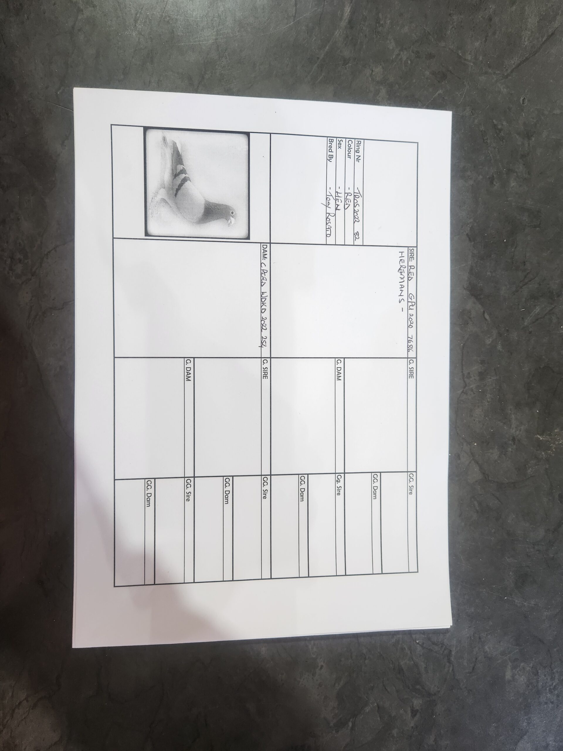 LOT 76 MARLBANK OLR – SANDGAWIES T2-ZA-24-GPU-3554 -SIRE:1020 GPU 21 ZA.Alias “Lot 17” Strain: NR Rocky Color: BBWF Lot 17 Jose Ferreira. Sire 12907, Son of 6x Winner. Dam 12905. Bred for stock, only cock out of this top pair. Brother to Lot 1, BBPD Hen GRPF 5816/21, Winner Jamestown.———-DAM:|3706 GPU 20 ZA Alias “Kelly” Strain: TTXManders/Jansen Color: BC Dinokeng entry 2021. 2nd Bloemfontein Hotspot 2. 3rd Club competion. Sth Ace bird competion.SEE PEDIGREE!!!