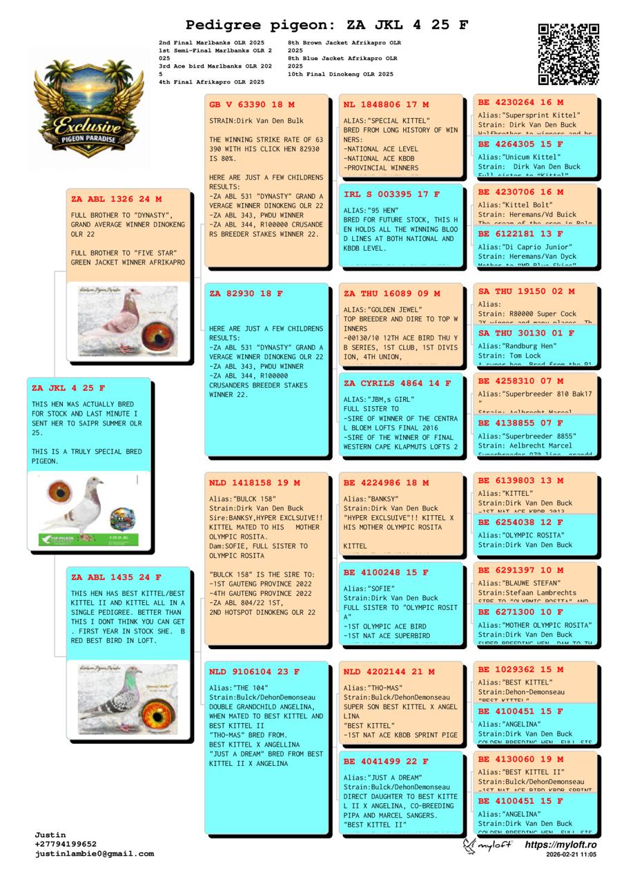 LOT 85 SAIPR SUMMER AUCTION 1 –Exclusive Pigeon Paradise 2- JKL 4 2025 -SIRE:ZA ABL-24-1326 С.ALWYN BESTER RCP FULL BROTHER TO “FIVE STAR”, GREEN JACKET WINNER AFRIKAPRO, ALSO BROTHER TO “DYNASTY” GRAND AVERAGE WINNER DINOKENG OLR 22.—————DAM:ZA ABL-24-1435 H.PARAMOUN KITTEL/BEST KITTEL BC THIS HEN IS GOLD, THE SIRE IS “BULCK 158” OF ALWYN BESTER, HE IS OUT OF “BANKSY”, WHICH IS SON TO FAMOUS KITTEL AND HIS DAM IS FULL SITER TO “OLYMPIC ROSITA”.SEE PEDIGREE!!!!