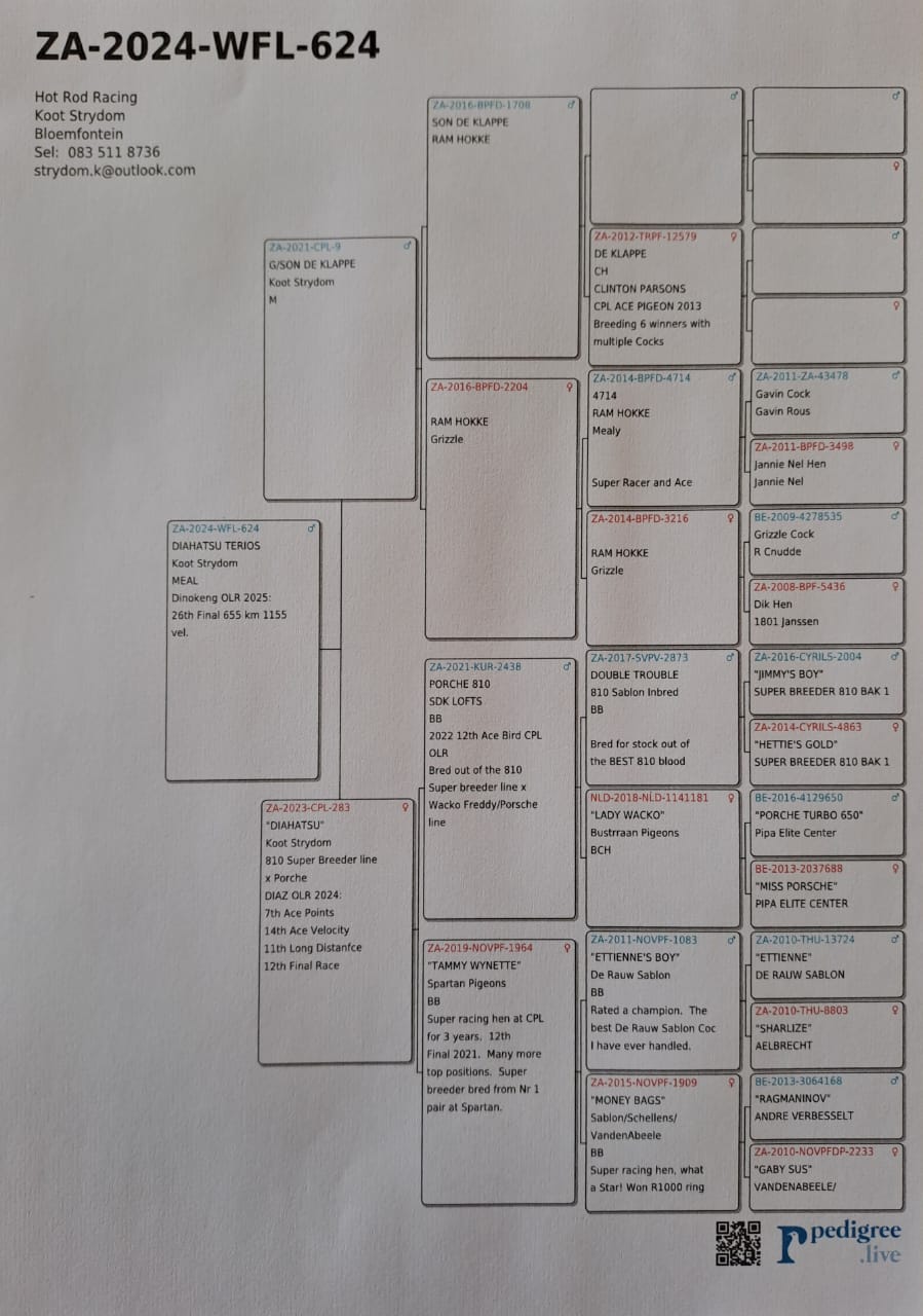 LOT 77 DINOKENG OLR – WILLSON/BENEKE/TOP PIGEON-ZA SANPO 24- 25941 HEN – KNOCKOUT – R3 – 5th R5,000 EQUAL WINNER—-SAME BRED AS “AFRIQUE” RACE 6 WINNER AFRIKAPRO 2025 2ND RACE 9 AFRIKAPRO 2025 – EQUAL WINNER. CURRENTLY 2ND BROWN JACKET AFRIKAPRO 2025—————-SIRE: ZA 23 CYRL 3505. 7TH FINAL AFRIKAPRO 2023. ANDREAS MOELLER BLOODLINES. 14TH BLUE JACKET ACE PIGEON AFRIKAPRO 2023.SIRE TO “AFRIQUE” RACE 6 WINNER AFRIKAPRO 2025 2ND RACE 9 AFRIKAPRO 2025 – EQUAL WINNER. CURRENTLY 2ND BROWN JACKET AFRIKAPRO 2025—————–—DAM : ZA 17 TRPF 5107. MCDERMOTT BLOODLINES . FLOR ENGELS/TOM LOCK/SILV. DAM TO “AFRIQUE” RACE 6 WINNER AFRIKAPRO 2025 2ND RACE 9 AFRIKAPRO 2025 – EQUAL WINNER. CURRENTLY 2ND BROWN JACKET AFRIKAPRO 2025. 5107 WERE ACE BIRD OVERALL DIVISION 2 2019. 3RD BEST BIRD OVERALL GAUTENG COMBINE 2019. 40TH BEST BIRD SHORT DISTANCE GAUTENG COMBINE 2019. 40TH BEST BIRD MIDDLE DISTANCE GAUTENG COMBINE 2019. 94TH BEST BIRD LONG DISTANCE GAUTENG COMBINE 2019. 2ND BEST BIRD SHORT DISTANCE O.E.R.F RAND 2019. 2ND BEST BIRD OVERALL O.E.R.F RAND 2019. 2ND BEST BIRD MIDDLE DISTANCE O.E.R.F RAND 2019. 4TH BEST BIRD LONG DISTANCE O.E.R.F RAND 2019. SEE PEDIGREE!!!!!!!