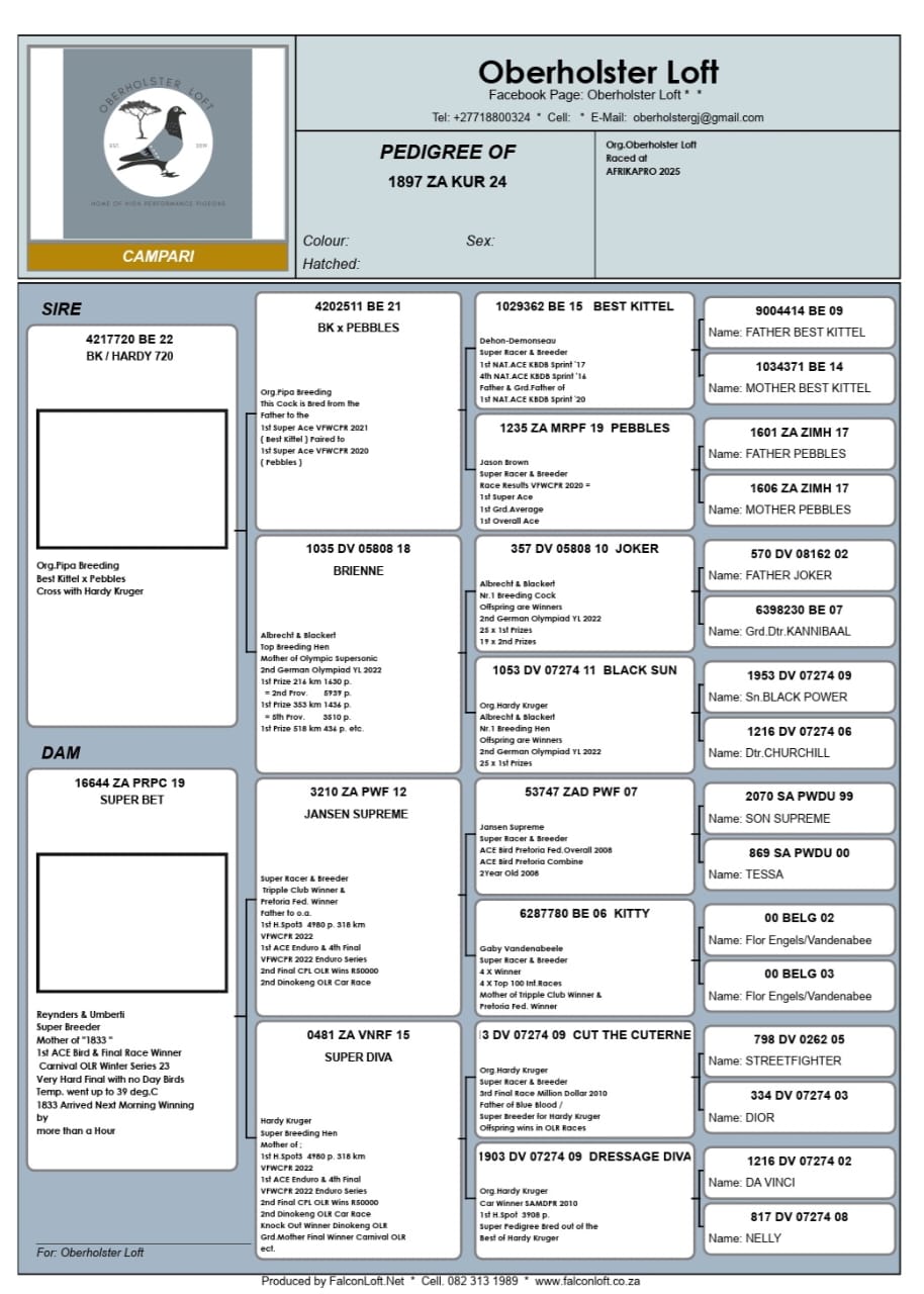 LOT 87 AFRIKAPRO AUCTION 3 – Hardy Krüger & Oberholster Loft-ZA-24-KUR-1897 -SIRE:4217720 BE 22 BK/HARDY 720.Org Pipa Breeding Best Kitel x Pebbles Cross with Hardy Kruger.———-DAM:6644 ZA PRPC 19 SUPER BET Reynders & Umberti Super Breeder Mother of “1833” 1st ACE Bird & Final Race Winner Carnival OLR Winter Series 23 Very Hard Final with no Day Birds Temp. went up to 39 deg.C 1833 Arived Next Morning Winning by more than a Hour.SEE PEDIGREE!!!