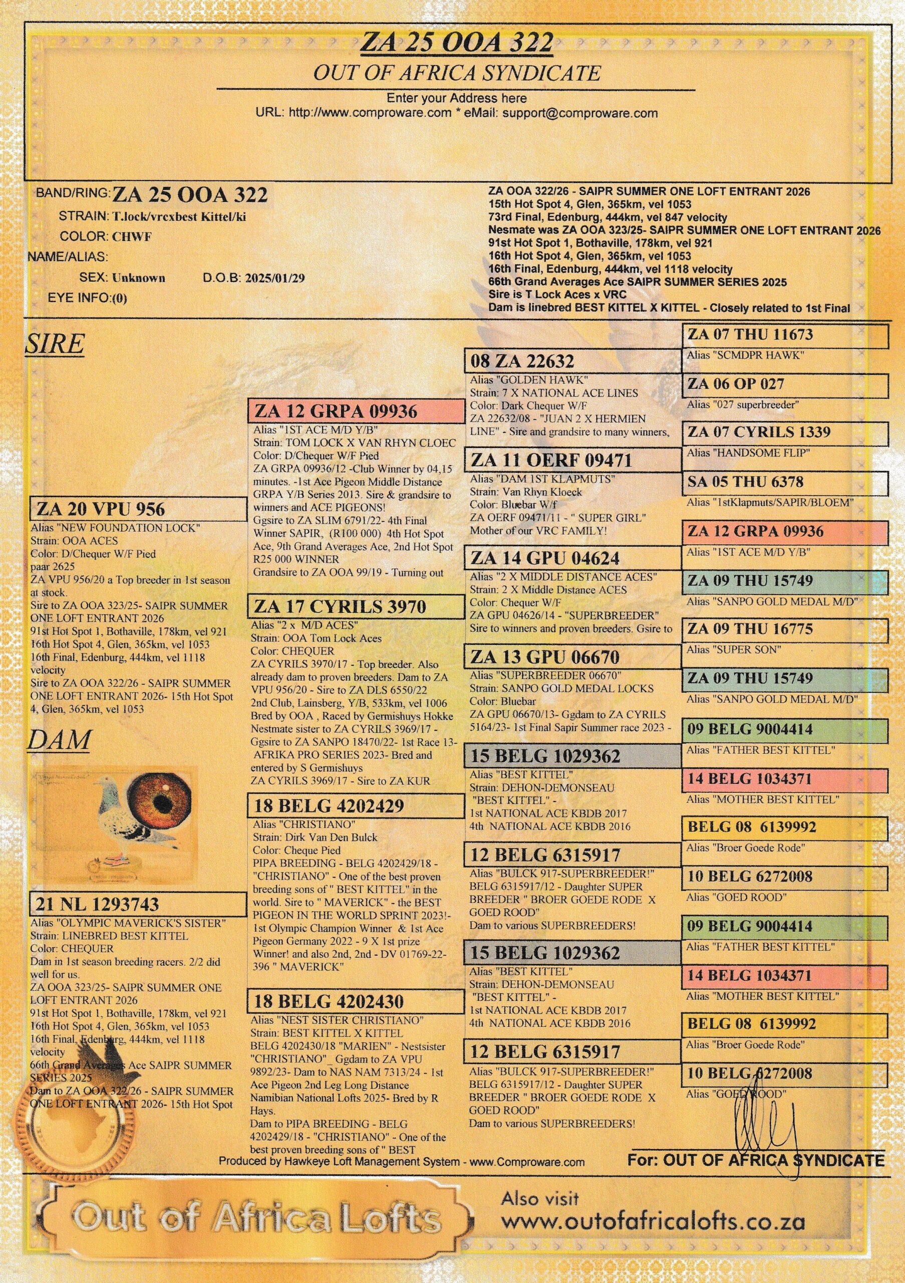 LOT 85 SAIPR SUMMER AUCTION 1 –Exclusive Pigeon Paradise 2- JKL 4 2025 -SIRE:ZA ABL-24-1326 С.ALWYN BESTER RCP FULL BROTHER TO “FIVE STAR”, GREEN JACKET WINNER AFRIKAPRO, ALSO BROTHER TO “DYNASTY” GRAND AVERAGE WINNER DINOKENG OLR 22.—————DAM:ZA ABL-24-1435 H.PARAMOUN KITTEL/BEST KITTEL BC THIS HEN IS GOLD, THE SIRE IS “BULCK 158” OF ALWYN BESTER, HE IS OUT OF “BANKSY”, WHICH IS SON TO FAMOUS KITTEL AND HIS DAM IS FULL SITER TO “OLYMPIC ROSITA”.SEE PEDIGREE!!!!