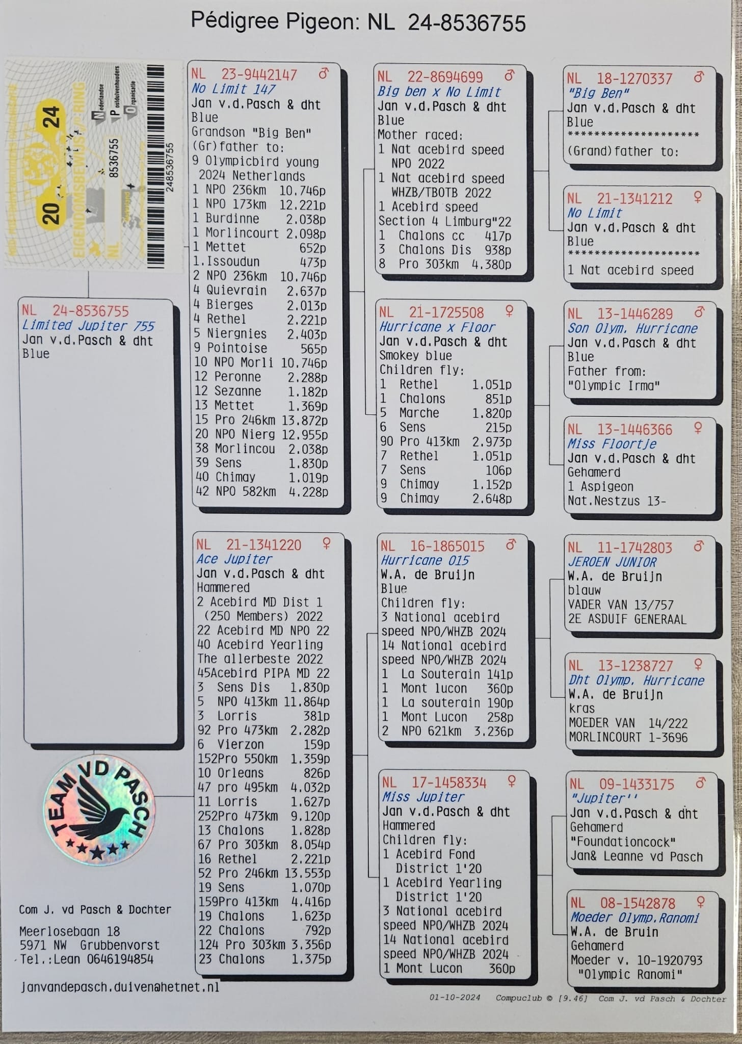 .LOT 9 AFRIKAPRO AUCTION 2 – Team Van Der Pasch – Wustmans-NL-24-8536755 -SIRE:23-9442147 No Limit 147 Jan v.d.Pasch & dht Blue Grandson “Big Ben” (Gr) father to: 9 Olympicbird young 2024 Netherlands.————DAM:NL 21-1341220 Ace Jupiter Jan v.d.Pasch & dht Hammered. 2 Acebird MD Dist 1 (250 Members) 2022. 22 Acebird MD NPO 22. 40 Acebird Yearling. The allerbeste 2022. 45Acebird PIPA MD 22. 3 Sens Dis 1.830p. 5 NPO 413km 11.864p.SEE PEDIGREE!!!