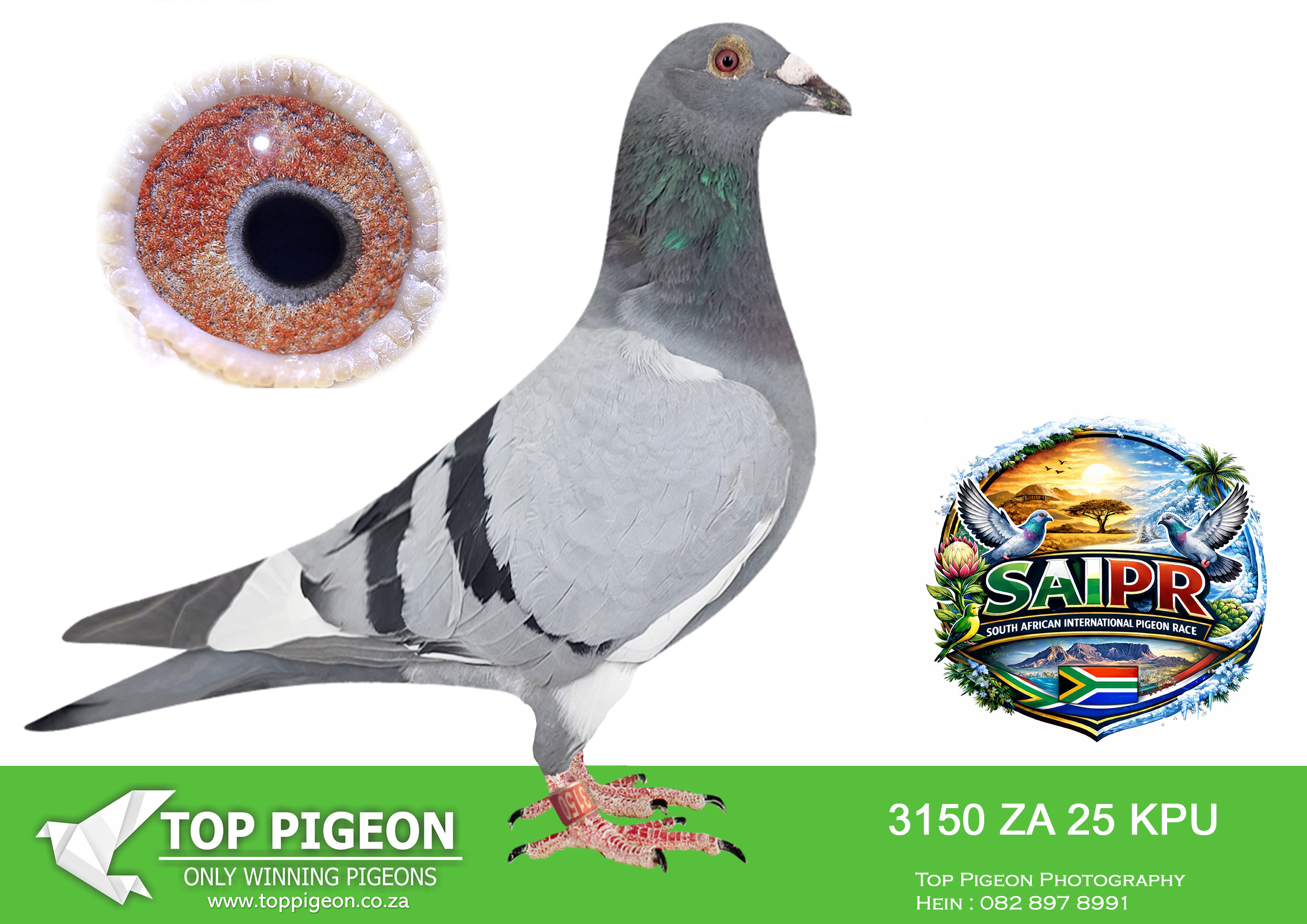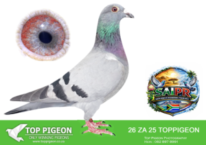 LOT 24 SAIPR SUMMER AUCTION 1 – Theuns Victor- VICTOR 107 2025 -9th Final Race WINNING R30 000.00——–SIRE:483 ZA 19 OOA .Alias “MR WOW” Strain: Tom Lock/Sablon Color: Blue Bar SUPER RACER 8 WEEKS IN A ROW FOR OOA LOFTS!! 7th Club, 18th VPU, Glen, Y/B, 286km, 1369mpm – 1993 pigeons 11th Club, 47th VPU, Tom’s Place, Y/B, 323km, 1416mpm – 2113 pigeons 49th Club, 152nd VPU, Springfontein, Y/B, 424km, 1014mpm————DAM:6493 ZA 21 KUR.Strain: Sablon/Tom Lock Color: Blue Bar.SEE PEDIGREE!!!!