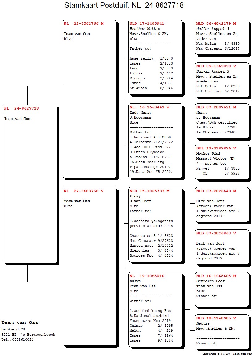 LOT 19 AfrikaPro Auction 2B – Team Van Oss – NL-24-8627728 -RACE 1 EQUAL WINNER , RACE 2 EQUAL WINNER , RACE 3 EQUAL WINNER———-SIRE:NL 22-8562721 M.Team van Oss blue.SIRE IS NL. 16-1663927 M Son Roney J.Hooymans.————DAM:NL 23-9173244 V.R.A. Bakker & Zn. DAM IS 21-1032912 V “GERMINY’S DREAM” R.A. Bakker & Zn Kras 2nd price winner NPO La Ferte St Aubin against 4435 p. Winner PIPA ranking combined Middle- en OLD races & 9th price winner PIPA ranking 2022 OLD.SEE PEDIGREE!!!