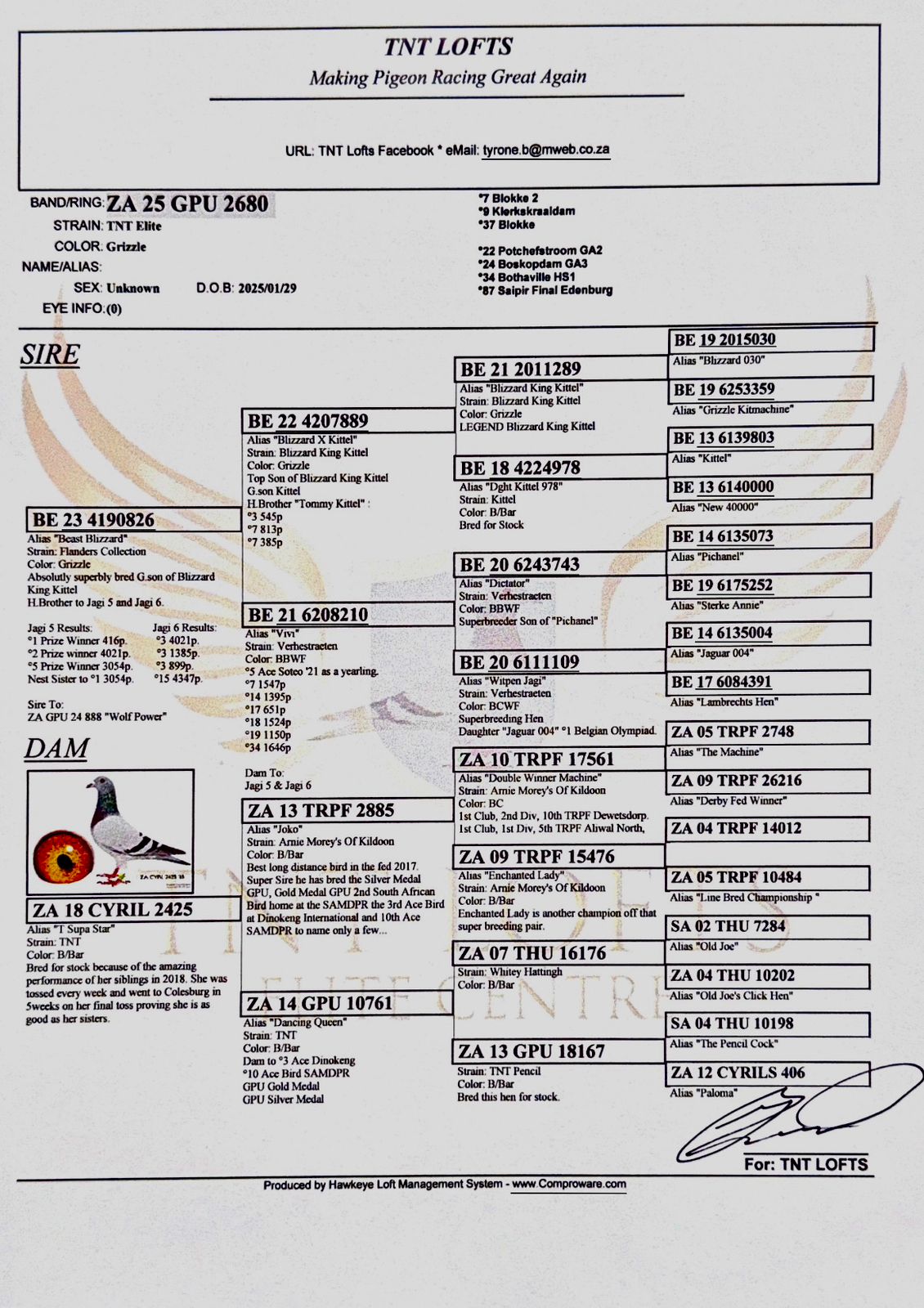 ZZ..LOT 112 SAIPR SUMMER AUCTION 1 –TNT Elite Centre 2- GPU 2665 2025 -HALF SIBLING TO 3RD AFRIKAPRO FINAL———SIRE:ZA 21 GPU 7438.Full Brother to GenLee 3rd Ace Dinokeng. Full Brother to 9799 GPU Ace YB. Full Brother to 13500 GPU Silver Medal .Half Brother to Bounty Hunter 2nd RSA Pigeon SAMDPR Final.————DAM:BE 24 4184573 Strain. Blizzard King Kittel Color: Grizzle.An incredibly well bred Gchild of Blizzard King Kittel purchased directly from Yannick De Ridder of Flanders Collection.SEE PEDIGREE!!!