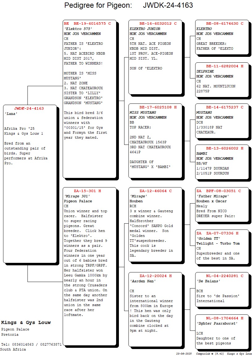 LOT 94 AfrikaPro Auction 2B – Kings & Gys Louw 1 – ZA-24-JWDK-4163 -SIRE:BE-19-6016575 C ‘Elektro 575’ HOK JOS VERCAMMEN.FATHER IS ‘ELEKTRO JUNIOR’: 5. NAT ACEBIRD KBDB MID DIST 2017, FATHER TO WINNERS!.MOTHER IS ‘MISS MUSTANG’ 2. NAT ZONE 3. NAT CHATEAUROUX SISTER TO ‘LILLY’ GRANDSON ELEKTRO’ GRANDSON ‘MUSTANG’.———–DAM:ZA-15-301 H ‘Mirage 301’ Pigeon Palace.Union winner and top racer. Halfsister to super racing pigeons. Great breeder. Click hen to ‘Elektro’. Together they bred 9 winners as a pair. Four federation winners in one year out of 6 babies bred in strong TRPF/GRPF. Her halfsister won Leeu Gamka 1000km by nearly an hour in the strong Crusaders club & PTA union. On the same day another. halfsister was 2nd union in the same race after her loftmate.SEE PEDIGREE!!!