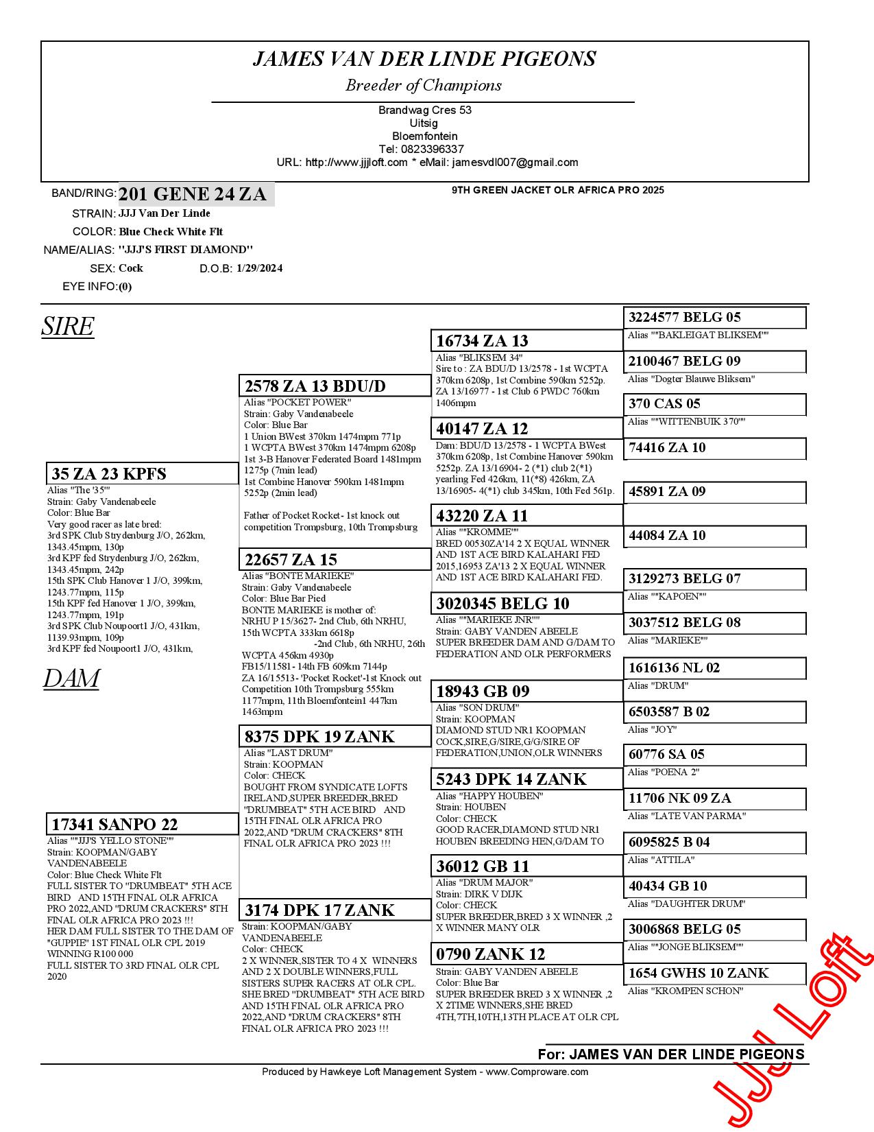 LOT 96 AFRIKAPRO AUCTION 2 -JJJ van der Linde & Van Staden Qualygrow 1-ZA-24-GENE-201 -SIRE:35 ZA 23 KPFS.Alias “The ’35 Strain: Gaby Vandenabeele Color: Blue Bar Very good racer as late bred: 3rd SPK Club Strydenburg J/O, 262km, 1343.45mpm, 130p.————DAM:17341 SANPO 22 Alias “JJ’S YELLO STONE Strain: KOOPMAN/GABY VANDENABEELE Color: Blue Check White Flt FULL SISTER TO “DRUMBEAT” 5TH ACE BIRD AND 15TH FINAL OLR AFRICA PRO 2022, AND “DRUM CRACKERS” 8TH FINAL OLR AFRICA PRO 2023 !!!SEE PEDIGREE!!!