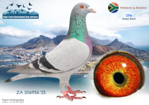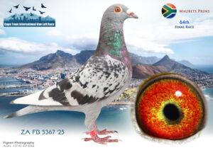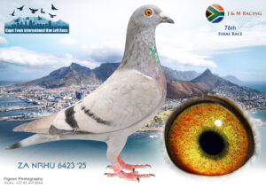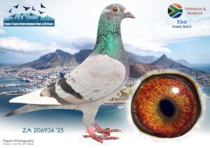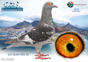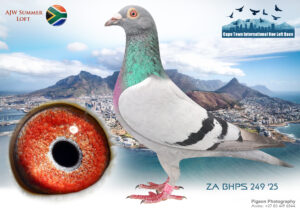 LOT 24 CAPETOWN LOFTS – J & T Engelbrecht Team 1-ZA-JT ENGELBRECHT-25-92*** -3RD HOTSPOT 1 —–HIS/HER BROTHER WON FINAL RACE 2025 OVER 601 KM AT CTIOLR, WINTER—–SIRE:52 JT ENGELBRECHT 24. “JOKER BEST KITTEL 24”. Engelbrecht: Forbes/Best Kittel/Shakira Mating Brother to Sister, both who already proved their value to breed EXCELLENT RACERS, LIKE WINNER 304 km DINOKENG, WHO BRED 4 TH ENDURO ACE AFRIKAPRO ’24, + HIS MOM BRED 31 ST ACE PIGEON AFRIKAPRO ’23..—————–DAM:41 JT ENGELBRECHT 24 BBAR Engelbrecht:Zander/Birdy/Rau britter/foot As Youngster of 2024, she achieved 7 th prize in Hotspot 2 over 220 km against 1301 Pigeons. Her father is a proven breeder for lower velocities. Her mother bred winners and close to winners on local and in OLR. She is a star breeder.SEE PEDIGREE!!!!