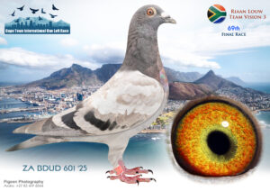 LOT 65 CAPETOWN LOFTS – Riaan Louw Team Vision 3-ZA-BDUD-25-601*** -SIRE:6145690 BE 23 JONGE DUIF BLAAUW.STEFAAN LAMBRECHTS.MY NO 1 STOCK COCK AFTER FIRST YEAR AT STOCK. OUT OF 4 BABIES BRED ONE IS TRIPLE UNION WINNER AND 2 TIMES TRUCK WINNER. TWO DAUGHTERS ARE ALSO TRUCK WINNERS.———-DAM:ZA 18 GPU 6137. TOM LOCK/SUMO.SEE PEDIGREE!!!!
