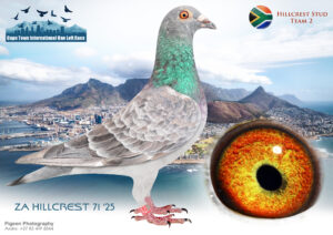 LOT 41 CAPETOWN LOFTS – Hillcrest Stud Team 2-ZA-HILLCREST-25-71 -SIRE:ZA 24 Hillcrest 038 NAME: Hillcrest Zeus SEX: cock COLOR: Grizzle 39th Final Cape Town Summer 2025 30th Ace Bird from an initial intake of 509 Nestmate to HILLCREST HYPE 4th place carnival gold cup 2025, winning R40000 4 minutes, 11 seconds behind the winner 2nd Ace bird from and initial entry of 337, winning R15000————DAM:ZA20 EDEN 04211 YEAR: 2020 SEX: hen COLOR: Chequer Pied Dam to THE SPECIAL ONE 10th /258 birds from 488km, Carnival Summer Final 2022, winning R70,000 13th Ace Bird Carnival Summer 2022 from an initial entry of 481 registered birds O4211, is a full Sister to HILLCREST GOLD This hen is turning out to be a fantastic breeder for Hillcrest Stud, and we know that at this age there is much more to come from this hen.SEE PEDIGREE!!!