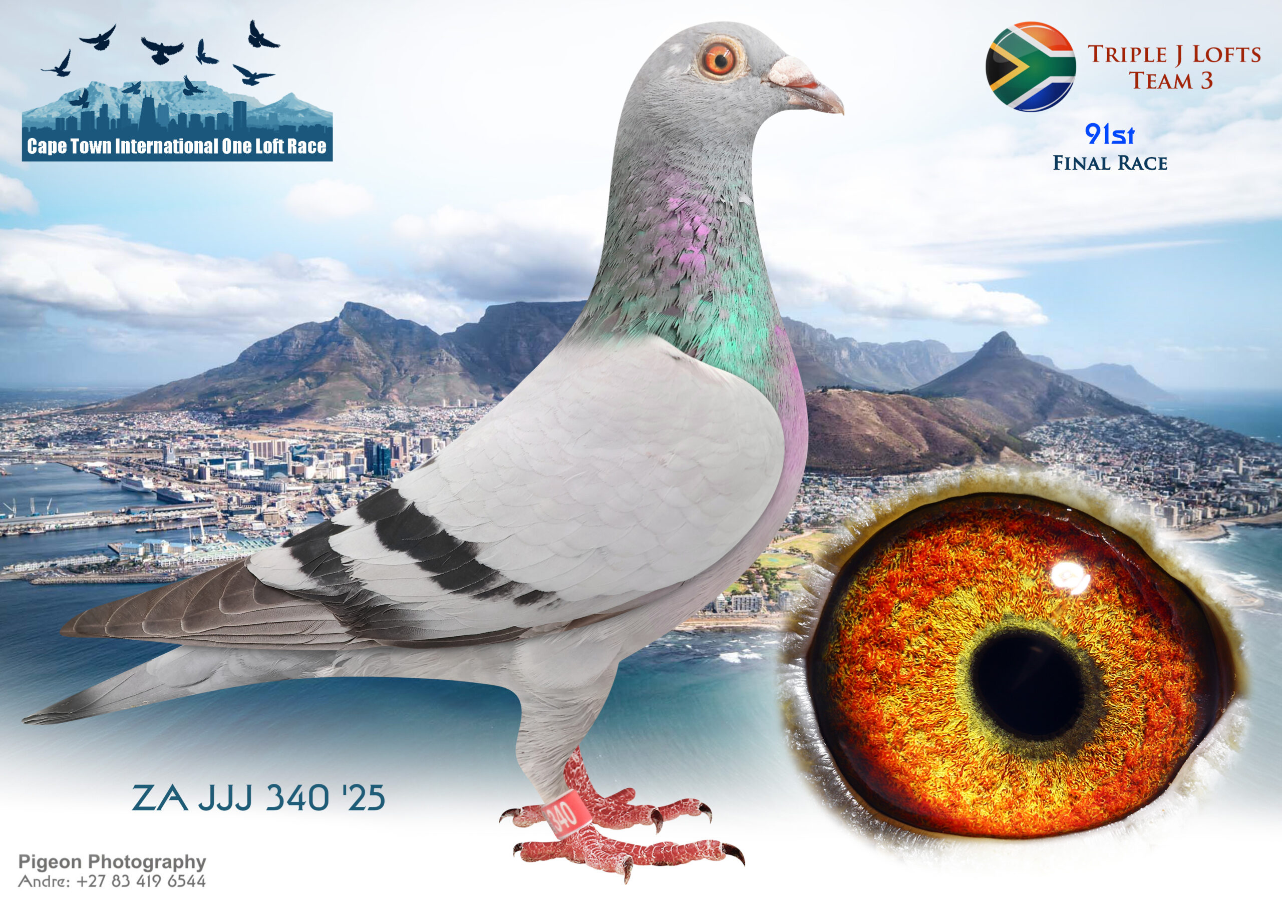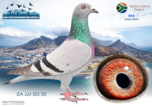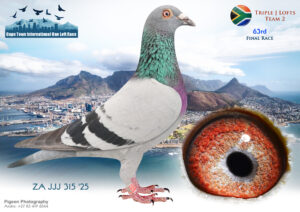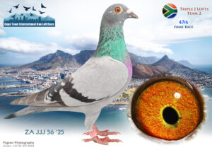 LOT 96 CAPETOWN LOFTS – Triple J Lofts Team 3-ZA-JJJ-25-340*** -Sire: ‘TOMMY’ ZA 2023 JJJ 107 Notes: TOMMY (completed 2024 Carnival Gold Cup) in his first breeding year bred two super racers in the 2025 Cape Town Summer Series – JEER & JUSTIFY – 1st & 2nd ‘Hot Spot’ Ace Pigeons after Hot Spot 4!!! ~ JEER (ZA 25 JJJ 69) –1st 2026 Cape Town Int Pigeon Race Hot Spot Ace – 9th HS 1 (175km), 24th HS 2 (225km), 15th HS 3 (275km) & 36th HS 4 (325km) ~ JUSTIFY (ZA 25 JJJ 340) – 2nd 2026 Cape Town Int Pigeon Race Hot Spot Ace 21st HS 1 (175km), 6th HS 2 (225km), 3rd HS 3 (275km) & 15th HS 4 (325km)————Dam: ‘BELLE’ ZA 2021 JJJ 307 Performance: BELLE was a SUPER racer at the 2022 Allflight Gold Cup Summer Series, winning: 4th Gold Cup Final! 2nd Ace Bird!! 5th Hot Spot 1!! 4th Hot Spot 2!! Belle was also mother of Jordy (13th 2022 Cape Town Summer Final)!SEE PEDIGREE!!!!