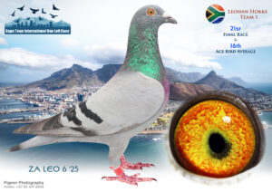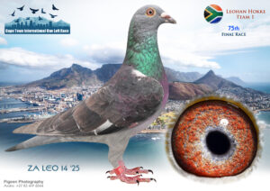 .LOT 1 CAPETOWN LOFTS – Leohan Hokke Team 1-ZA-LEO-25-24*** -1st Final Race Winning R140 000.00 , 2nd Ace Bird Winning R25 000.00 , Team Comp Winner Winning R25 000.00————-SIRE:ZA-2021-OERF-6097 “LITTLE JOHNNY” Booyse Family Lofts. GANUS. World-class bred back to “Wolverine” Father to: 1e Final Cape Town Int. Summer 2026. 2e Ace Cape Town Int. Summer 2026.————-DAM:ZA-2023-VSD-774 Leohan Lofts.Linebred to “Mr Africa” One of the Superstars and Top Breeders! He bred 24 pigeons scoring in the Top 10 in One Loft Racing over 4 years! Half-sister to o.a 3e Noupoort 565km Marlbank 2025. 12e Springfontein 442km Marlbank 2025. 21e Reddersburg 365km Marlbank 2025. 23e Ace Saipr Winter 2025. 25e Colesberg 520km Marlbank 2025. 30e Hotspot 1 Saipr Winter 2025. 69e Hotspot 3 Saipr Winter 2025. 79e Hotspot 4 Saipr Winter 2025. 162e Final Saipr Winter 2025. 114e Hotspot 2 Saipr Winter 2025.SEE PEDIGREE!!!