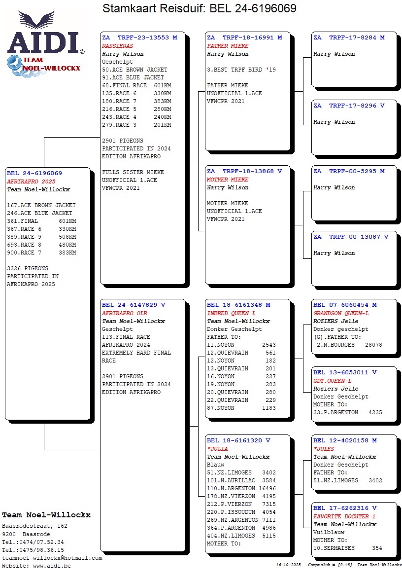 LOT 20 AFRIKAPRO AUCTION 3 – Tom van Gaver – Alberto Abajo ES-BE-25-4056625 -SIRE:BE 23-4180853 C Victory Golden Pipa Breeding Dark Chequered WF (Gr-) Father to: 44.-47.-49.-94.-100. -107 Final Races 17.Ace 3 x 500Km 29. Average Speed 36.Overall Ace Avirings OLR 2025 Victory Golden won: 14. Ace Sprint AFRIKAPRO OLR 2023 His father is: VICTORY BEST KITTEL: 1. Super Ace VFWCPR————DAM:23-4071412 H Finn’s Dream 12 V. Gaver & A.Abajo Dark Chequered WF Mother to winners: 44. Final Race 500Km 107. Final Race 500Km Avirings OLR 2025 Full sister to breeders/winners: 1. Overall Ace 25 1. Overall Ace YL’25 (17 races in a row).SEE PEDIGREE!!!