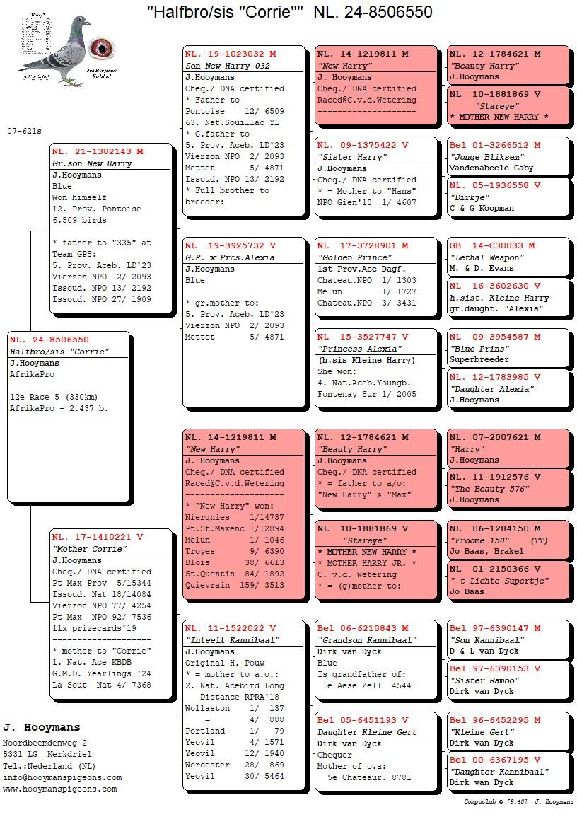 LOT 97 AFRIKAPRO AUCTION 4 – Team Hooymans – II-NL-24-8506550 -12TH RACE 5——SIRE:NL. 21-1302143 M Gr.son New Harry J.Hooymans Blue Won himself 12. Prov. Pontoise.———DAM:NL. 17-1410221 V “Mother Corrie” J. Hooymans.Cheq. DNA certified. Pt Max Prov 5/15344. Issoud. Nat 18/14084. Vierzon NPO 77/ 4254. Pt Max NPO 92/ 7536. 11x prizecards’ 19.*mother to “Corrie” 1. Nat. Ace KBDB. G.M.D. Yearlings ’24. La Sout Nat 4/ 7368.SEE PEDIGREE!!!